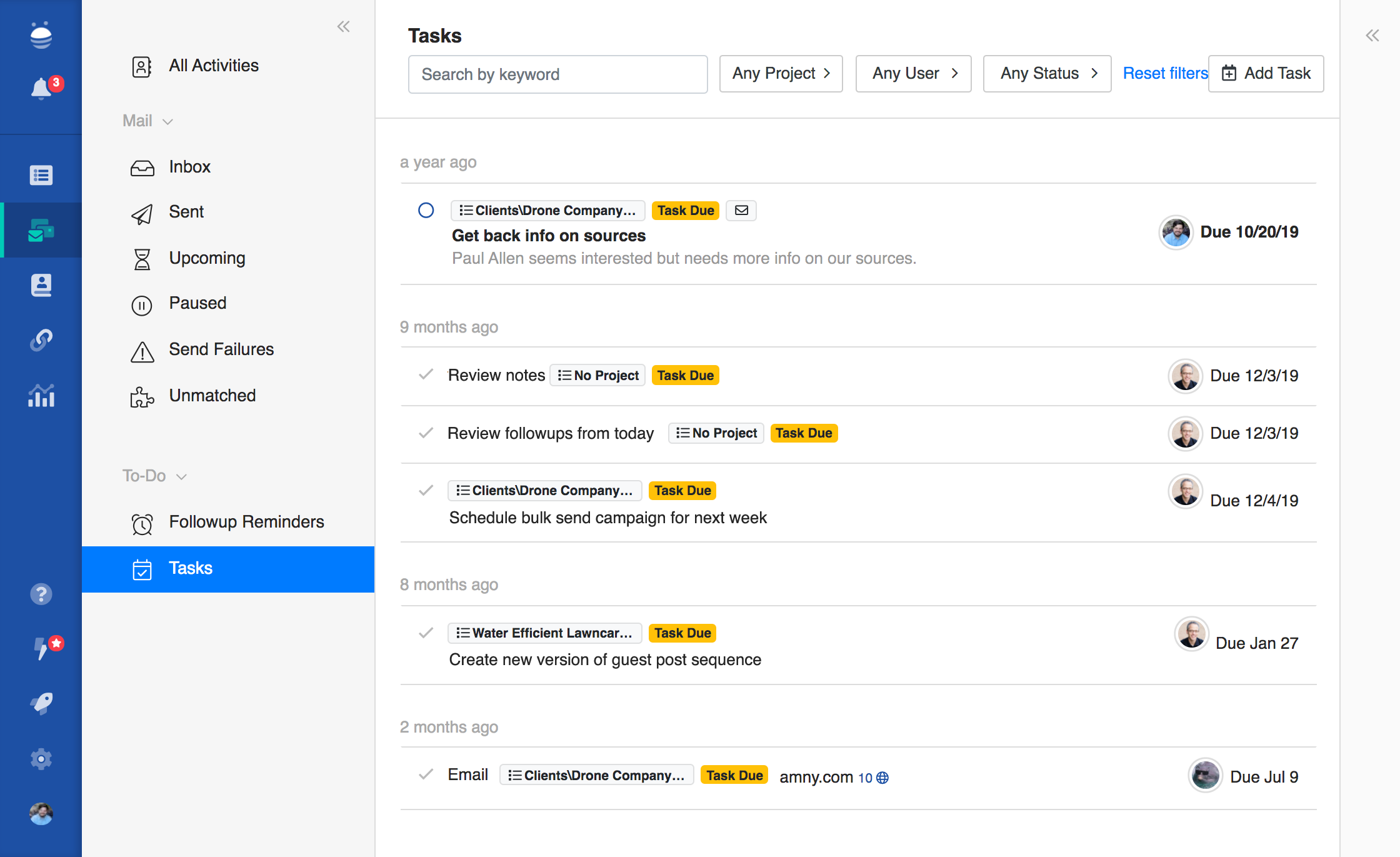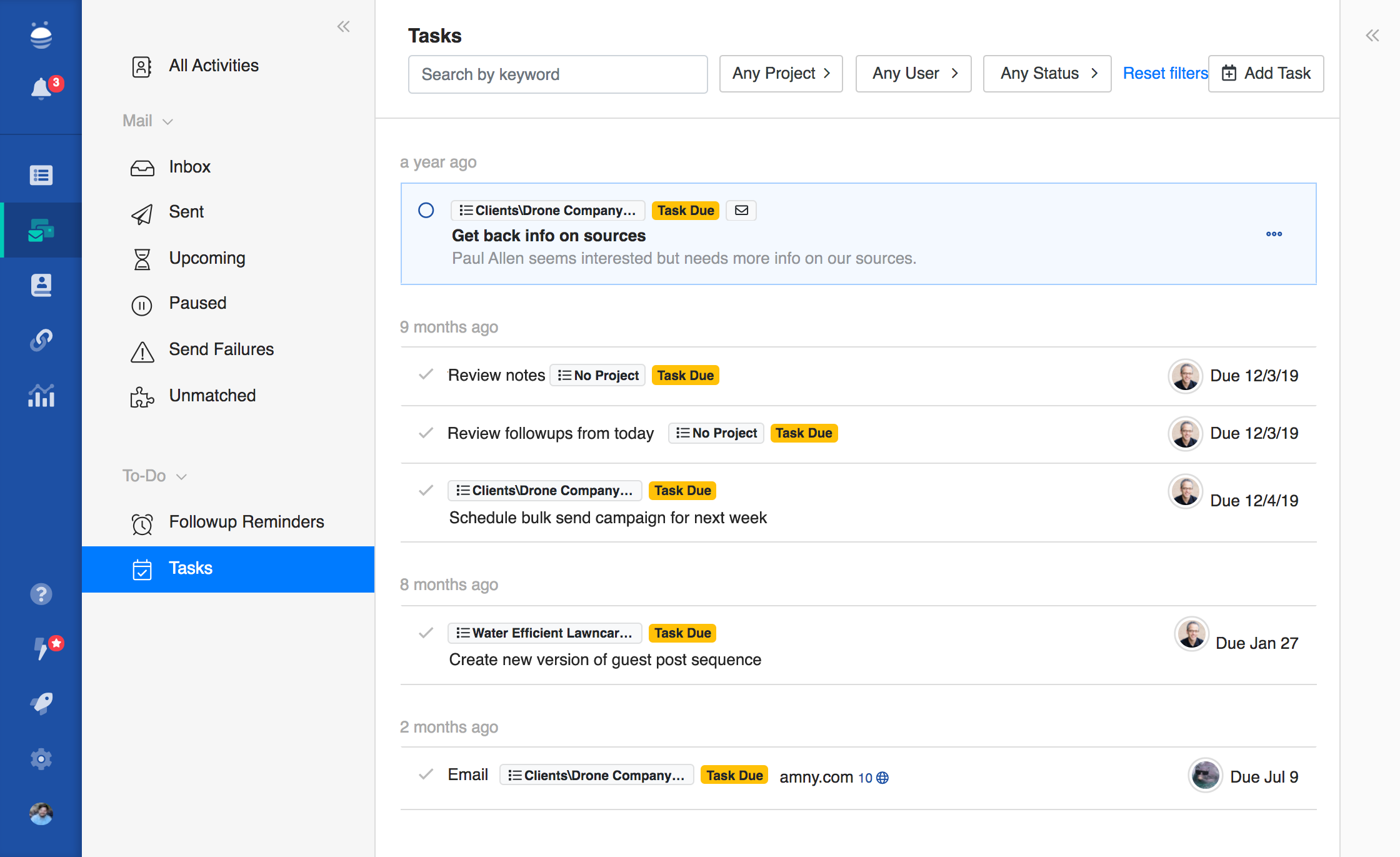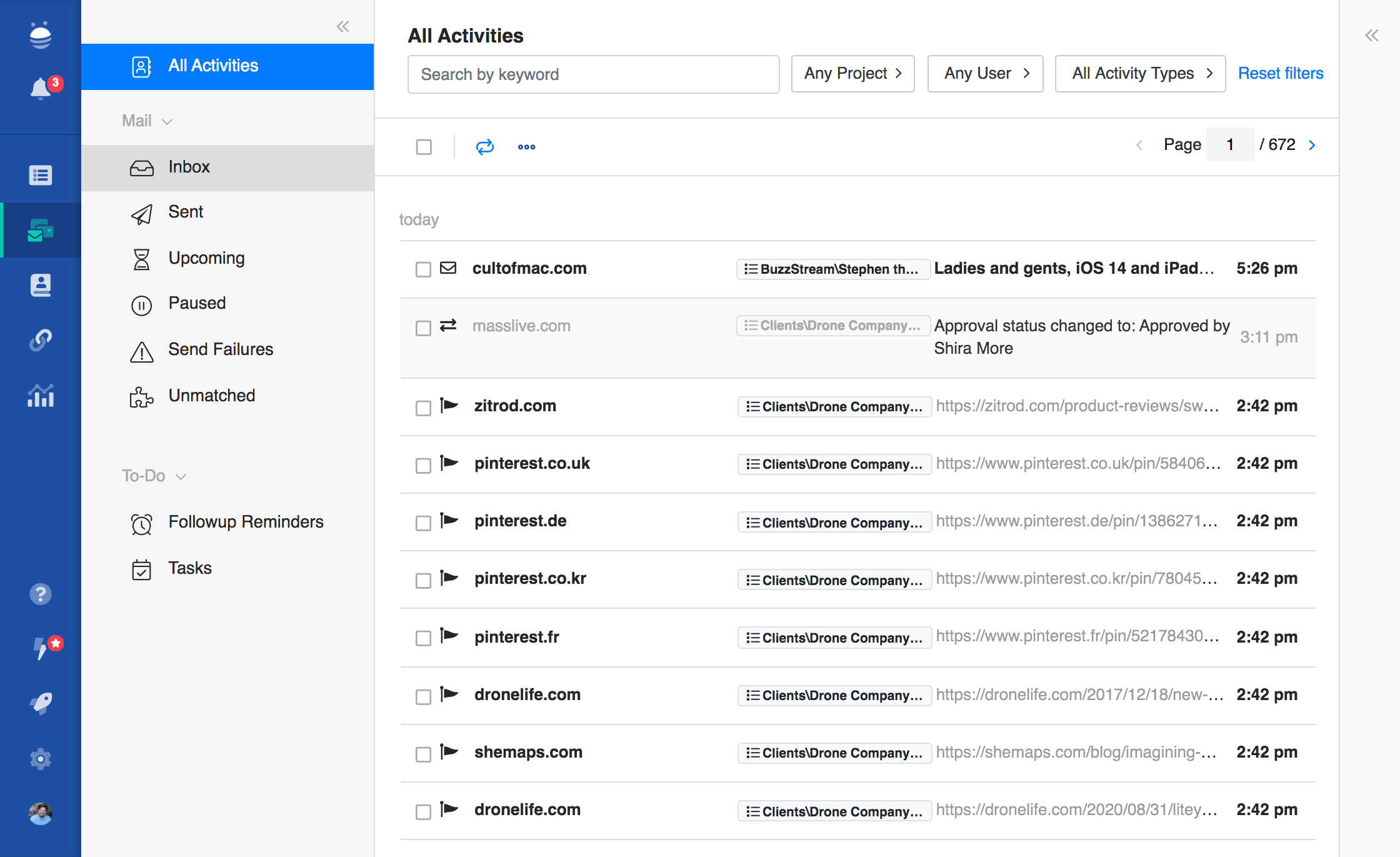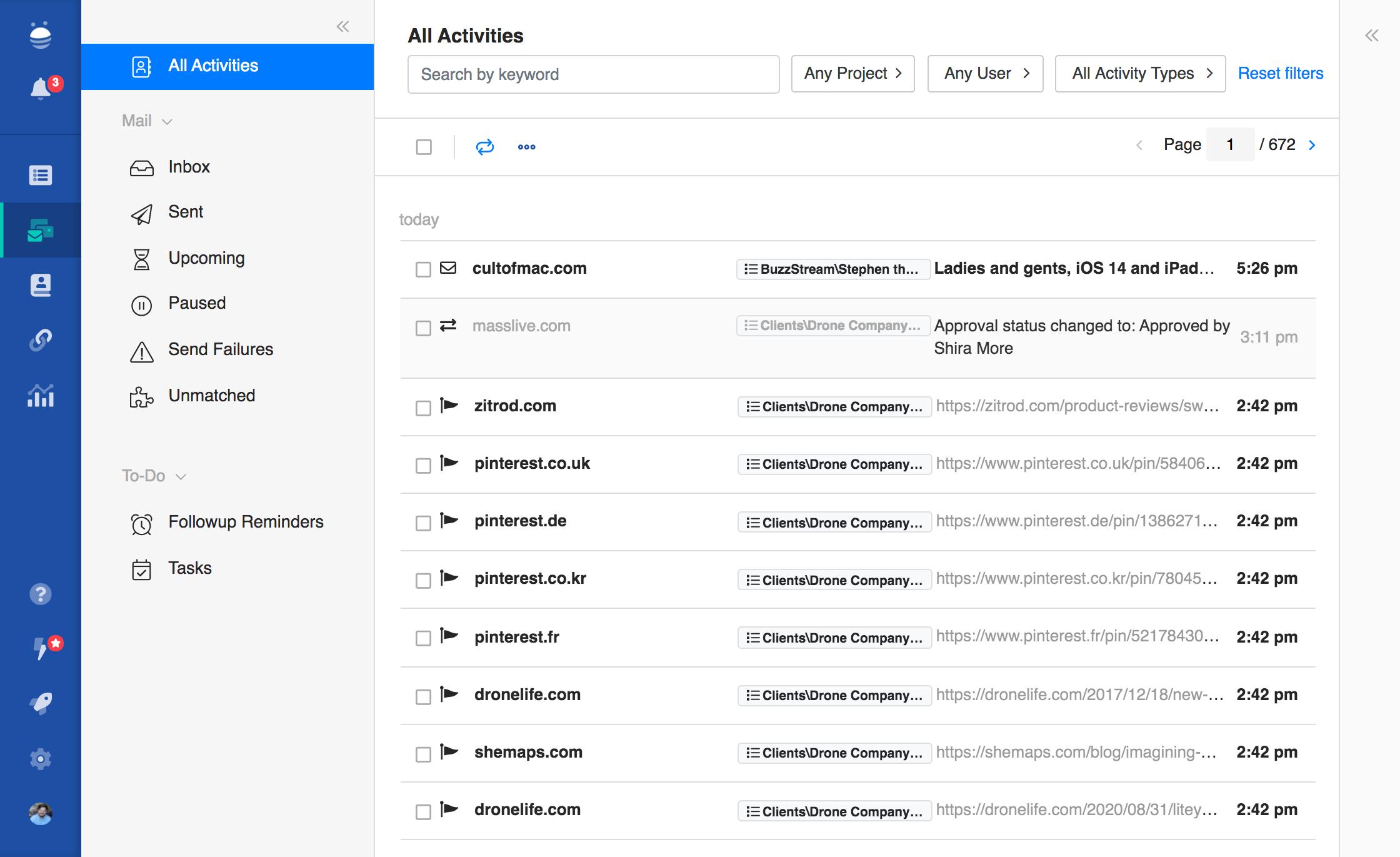 Get a complete view into your team’s recent activity, like notes added or outreach sent. Sort by project or by team member.