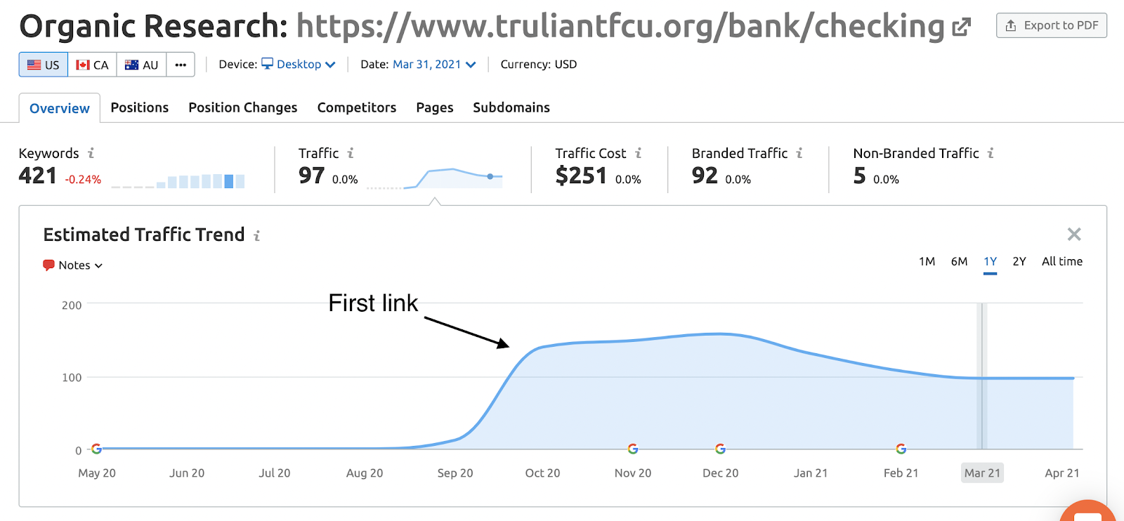 Certain pages on your site could be in a position where they are just a few backlinks away from ranking competitively for their target keywords. In this case, it can help to build links to those specific pages. This is where building links to specific pages versus an entire site, can help significantly increase ROI on linking efforts. These same pages could be your revenue-driving pages where you’ll benefit most from organic growth. This happened to be the case for Truliant.