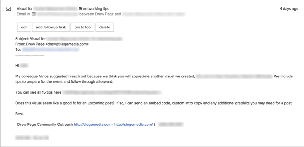 The ‘History’ feature in BuzzStream lets us easily see who else has reached out to a particular prospect and, more importantly, what was already said in an email. If we see that an email has been sent, but hasn’t gotten a response, we can tweak the email copy moving forward. We can also check to see which journalist or blogger was emailed.