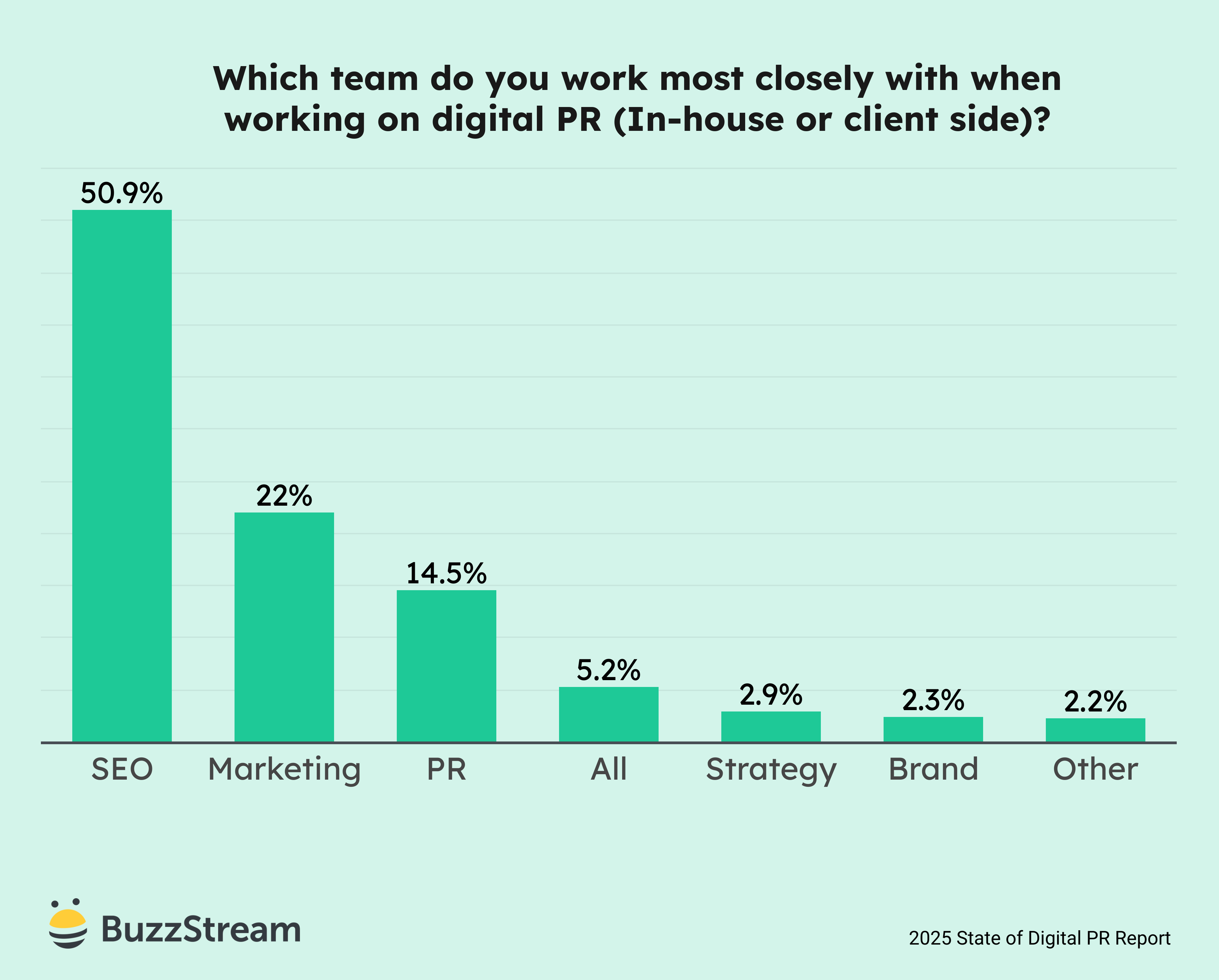 Just over half of the respondents work most closely with SEO teams. Surprisingly, only 14.5% work most closely with PR and even less (2.3%) with Brand teams.