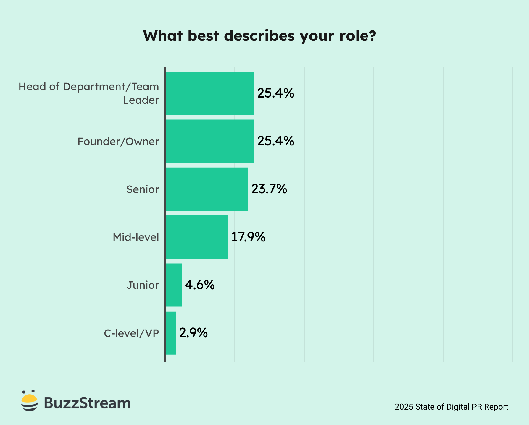 This study presents a nice mix of roles with a fairly even split between Founders (25.4%), Departments Heads (25.4%), Senior members (23.7%), and Mid-level roles (17.9%).
