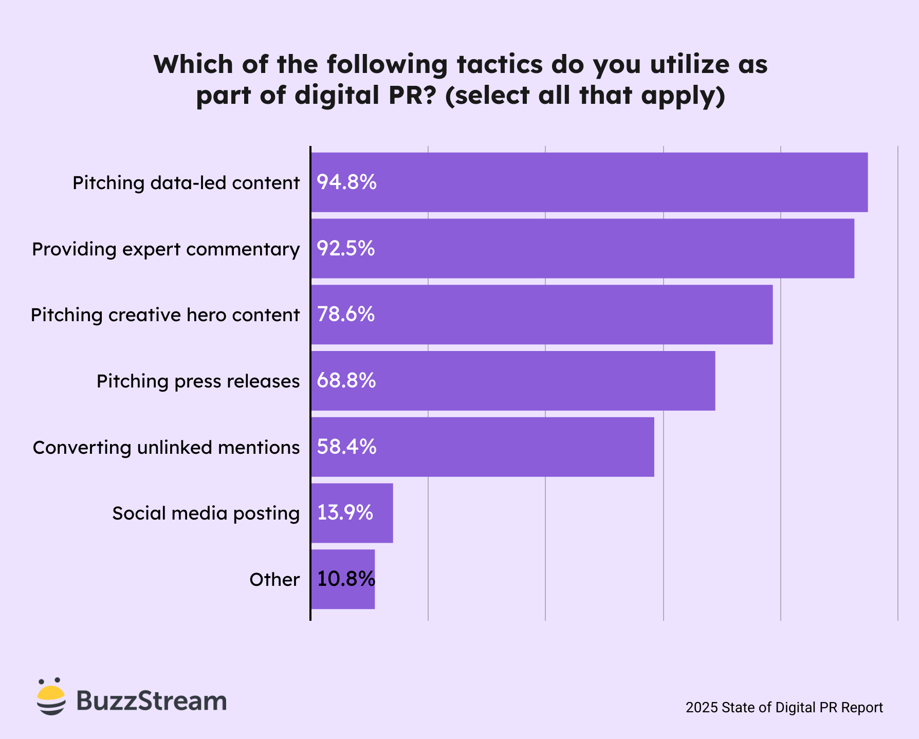The most commonly used tactics in the digital PR toolkit align with the definition in the first section of our report: pitching data-led content (94.8%), expert commentary (92.5%), hero content (78.6%), and press releases (68.8%).