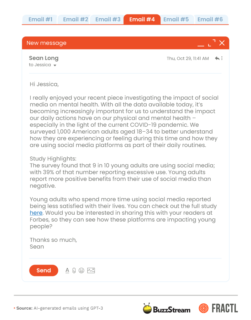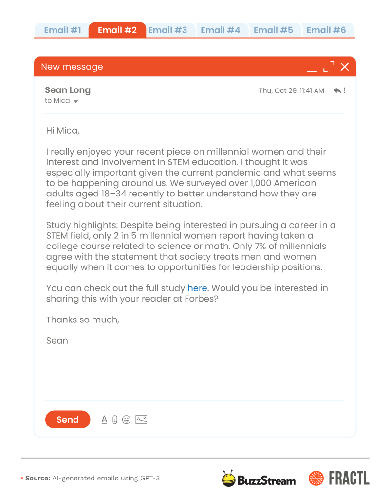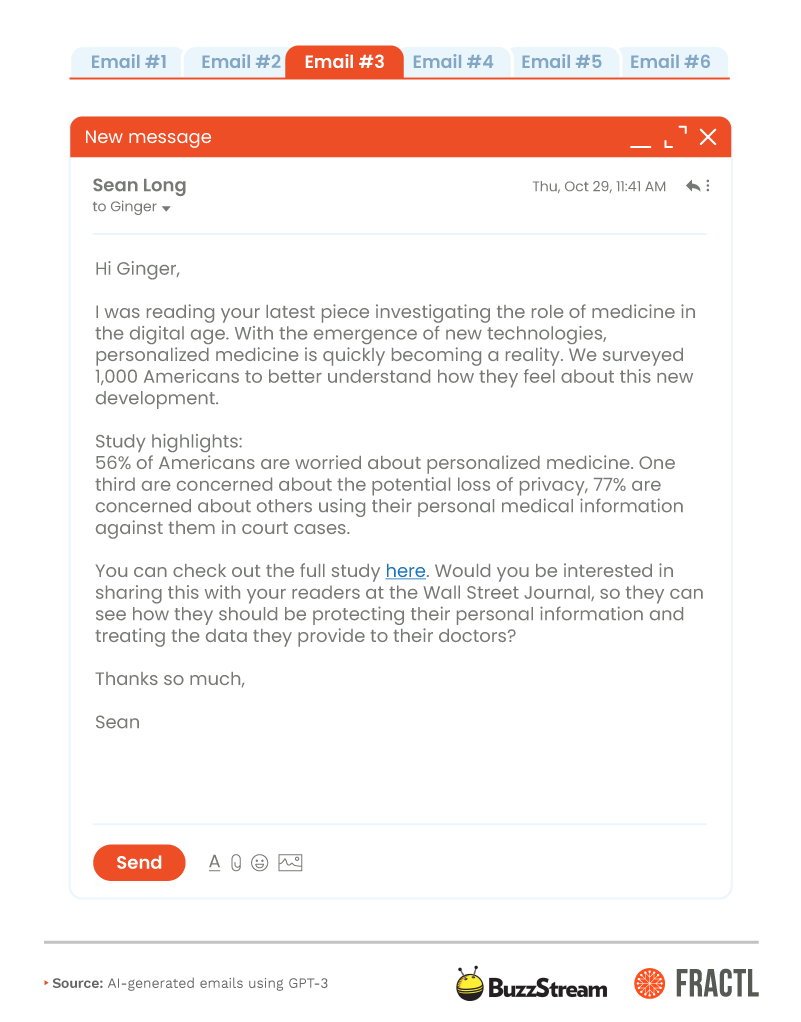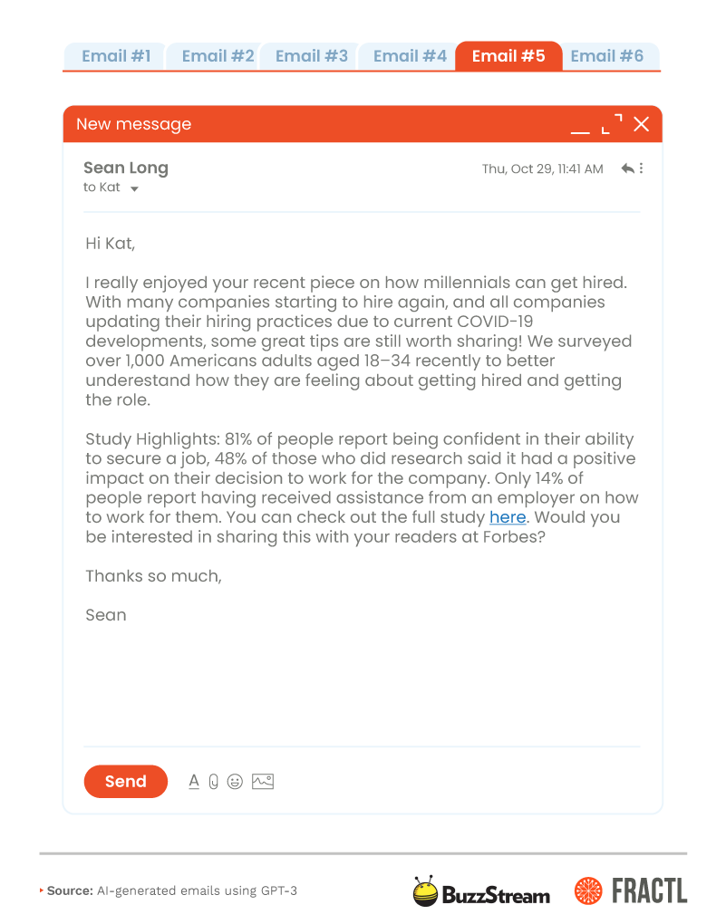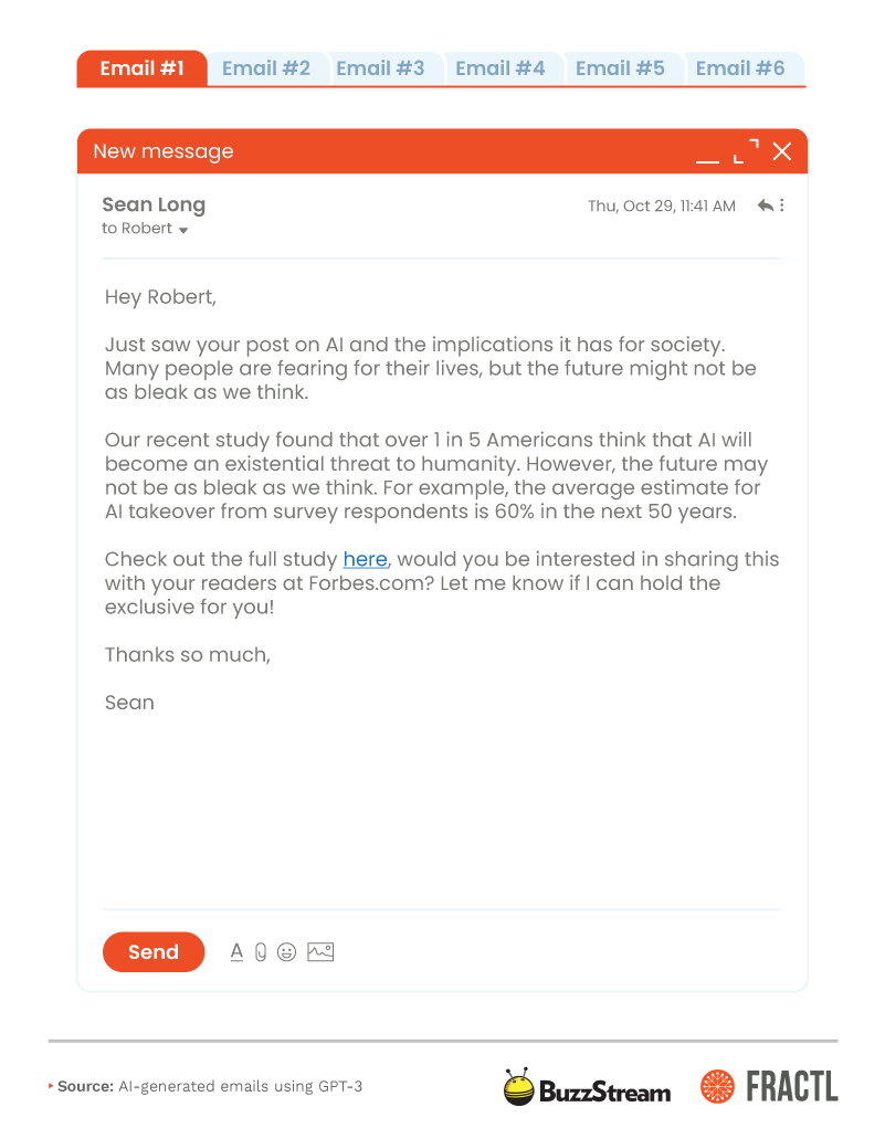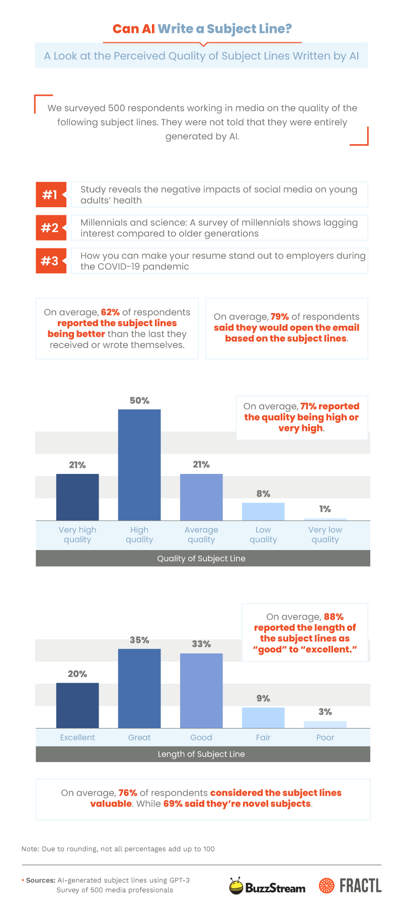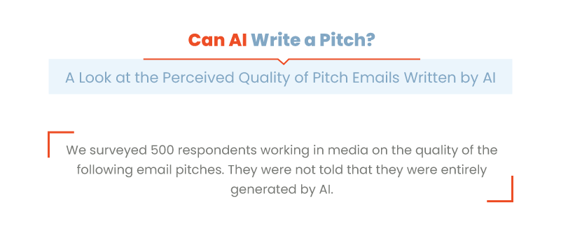 We collected results from 500 Media professionals working in digital PR, journalism, digital marketing, and promotions. The survey was designed with the intent of testing human perceptions of AI-generated subject lines and email pitches presented to them. Respondents were not informed that subject lines and emails were AI-generated. Limitations due to self-reporting apply, including exaggeration, telescoping, and selective memory. Subject lines and emails were generated using GPT-3, a text-generating program from OpenAI. GPT-3 was given a set of prompts in order to generate email pitches, but for efficiency, not every variation of each prompt was used. GPT-3 output could vary based on word count and word variation of prompts.