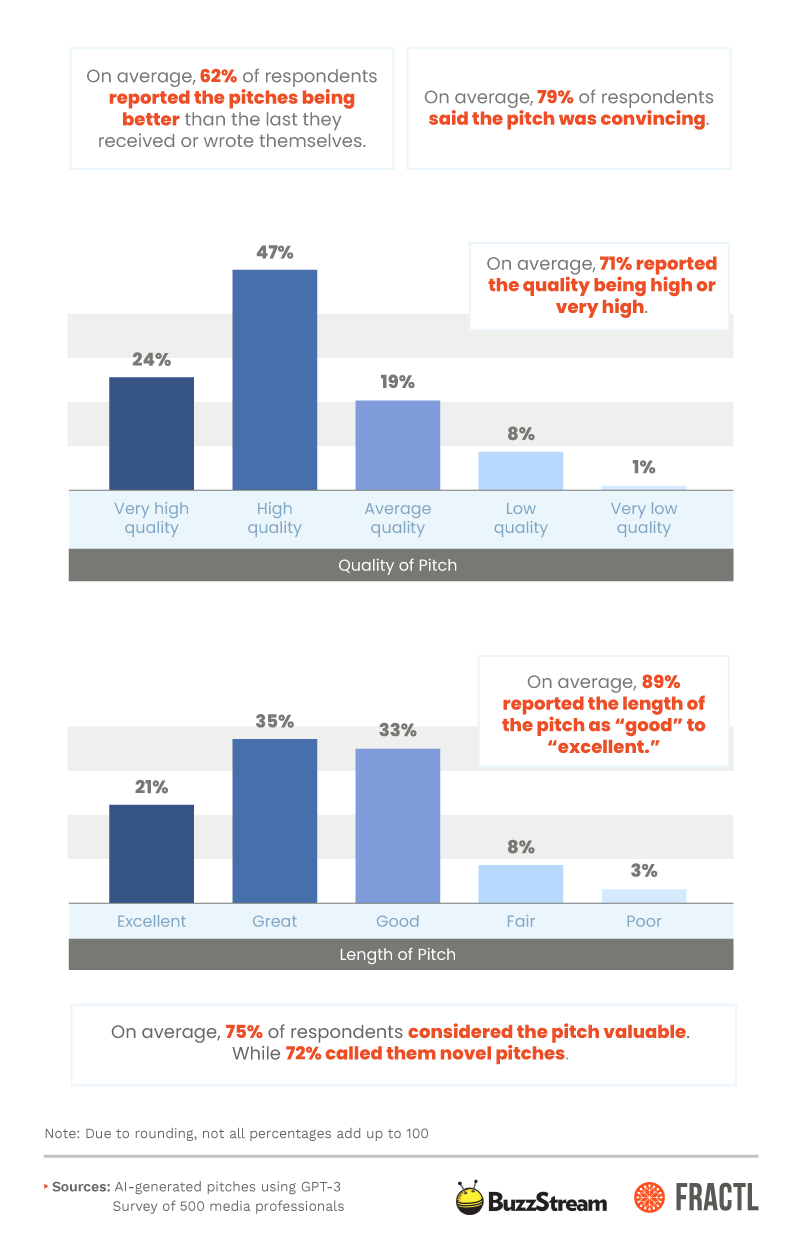 Three-fourths considered the AI pitches valuable, and 72% deemed them novel. Also interesting is that 79% of respondents said the AI-produced pitches were convincing. Writing an email pitch worth reading is one thing, but crafting one that persuades a journalist or media professional to buy into your campaign is what success in marketing looks like – and AI passes the test.