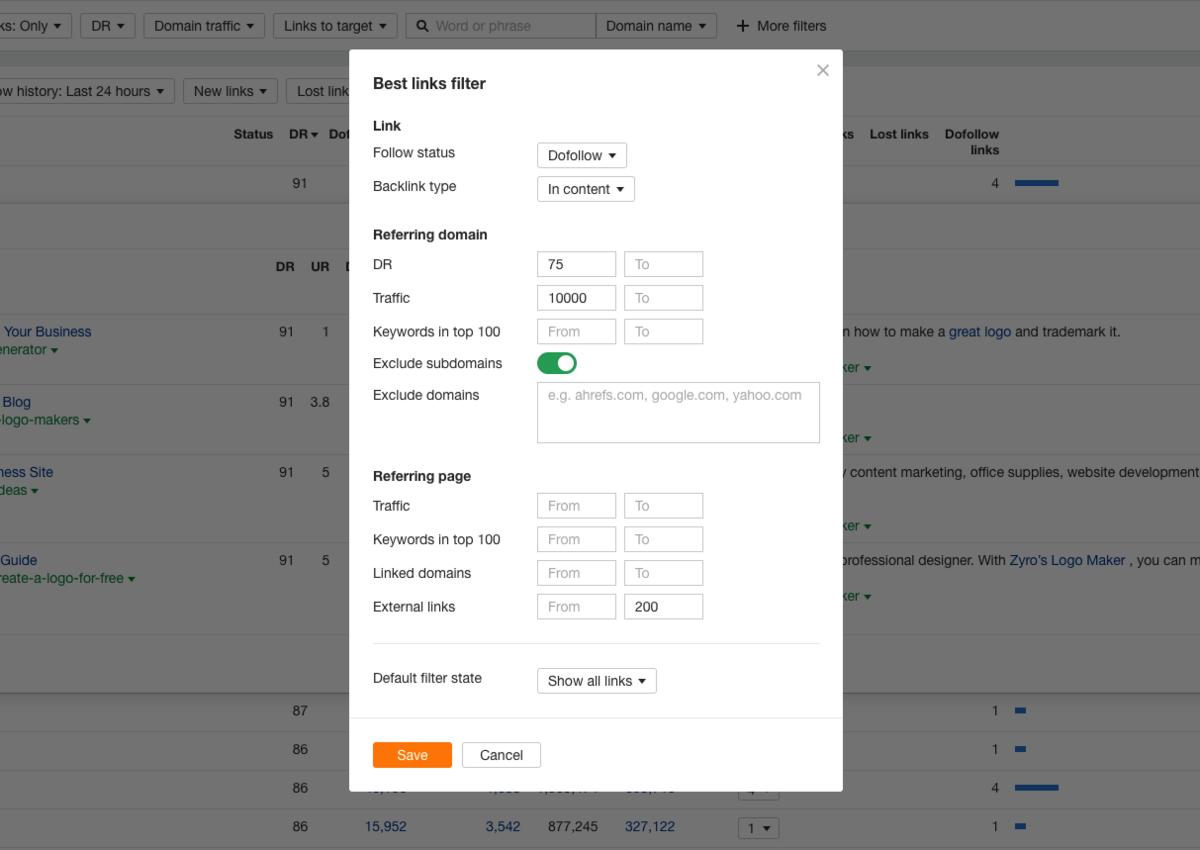 I can use Ahrefs’ “Best links” filter to identify the number of quality links. I’ll set DR to greater than 75 and the Traffic to greater than 10000.