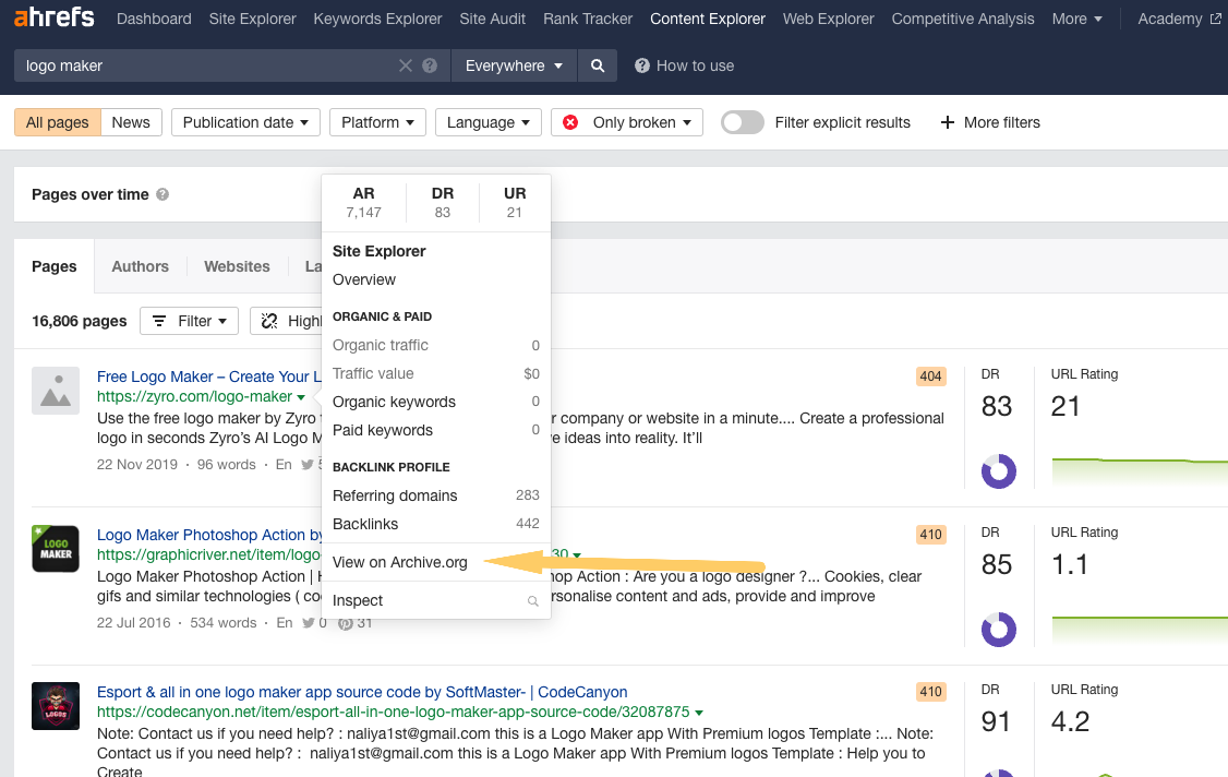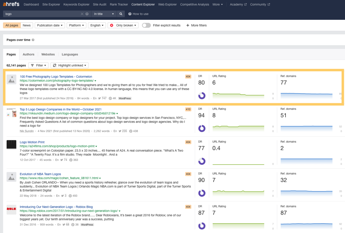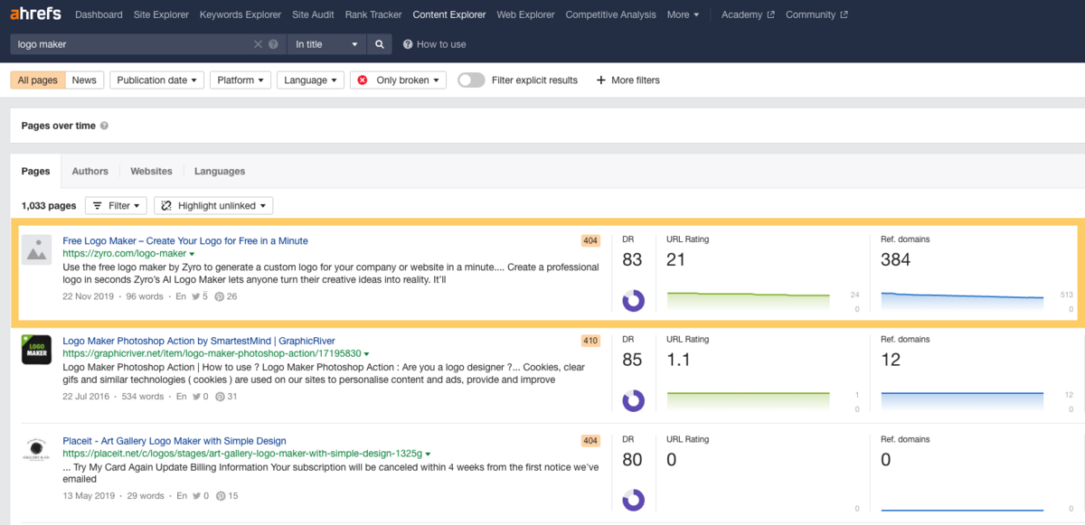 You can find broken content using a tool like Ahrefs’ Content Explorer.