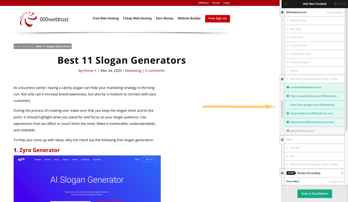 Then, when I open the URLs, the BuzzMarker will pull in any contact information it finds.