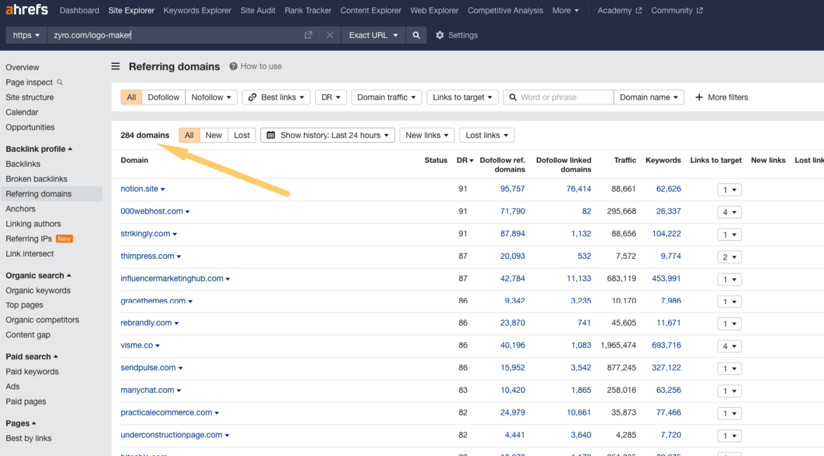I see a site called Zyro has a free logo maker with 384 referring domains. After clicking on the site, I can confirm that it is broken.