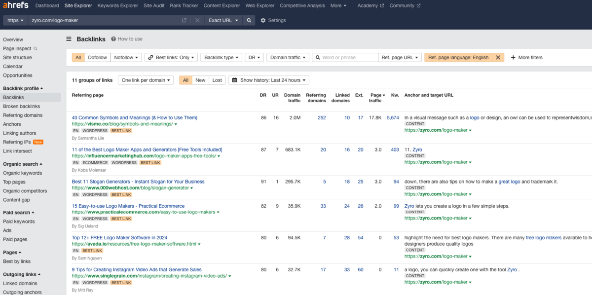 With this filter, that initial list of 284 dropped to 12 quality referring domains. (I’ve also set to look at English only, bringing this down to 11.)