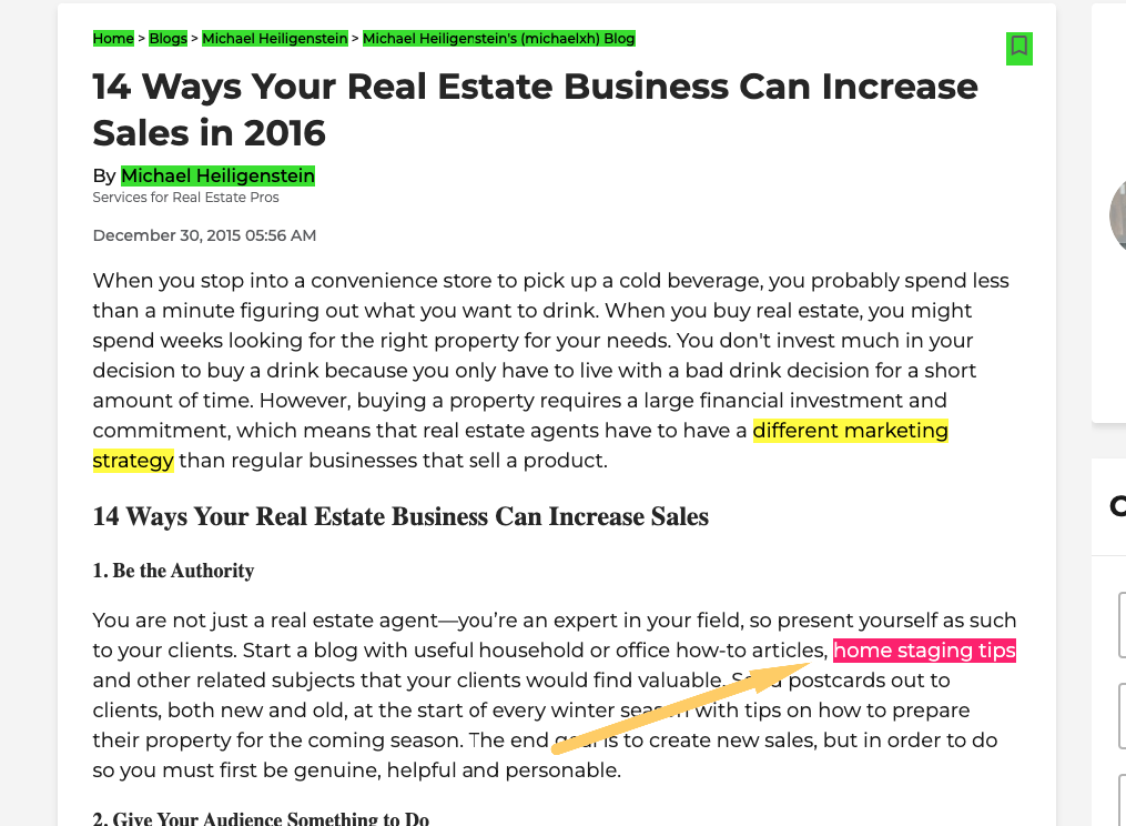 Specifically, the link with the anchor text “home staging tips” under the first section, “Be the Authority.”