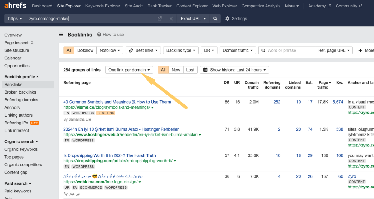 Ahrefs’ Content Explorer shows all links, while their Site Explorer has a time frame filter.
