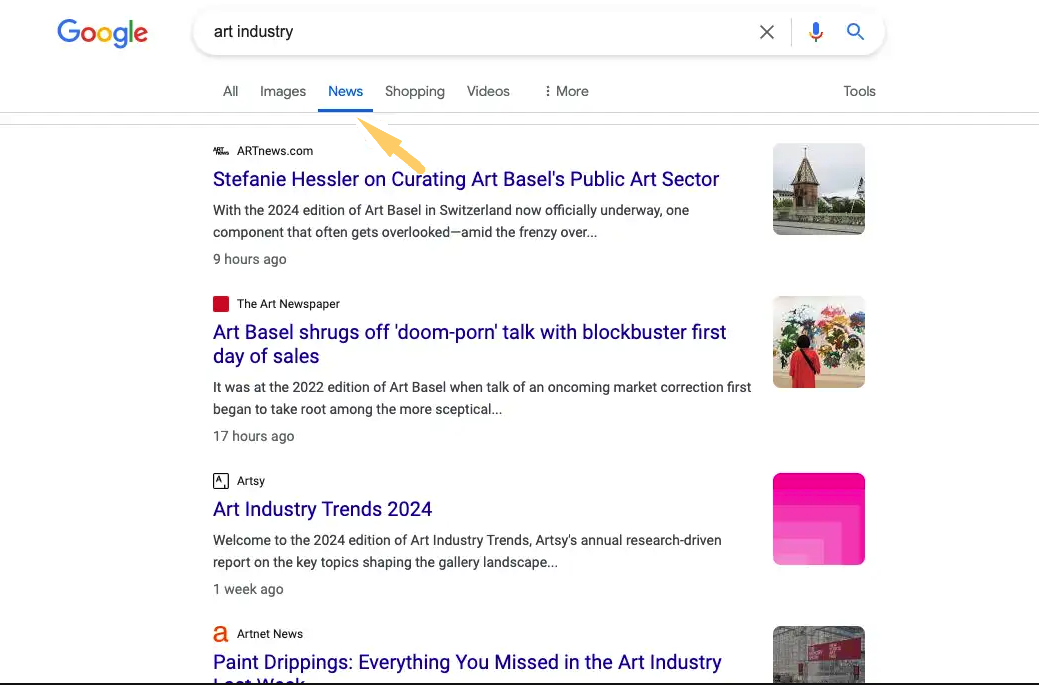 For example, you can search “art industry” and filter to “News” up top, and this will take you right to the types of publications that cover topics like this in that industry.