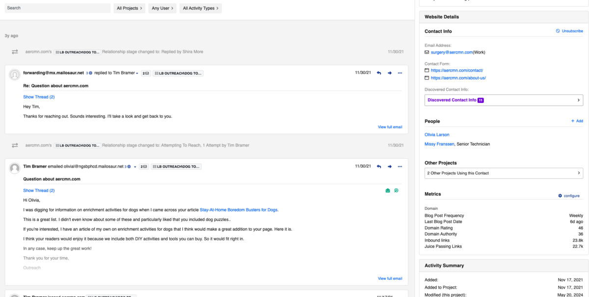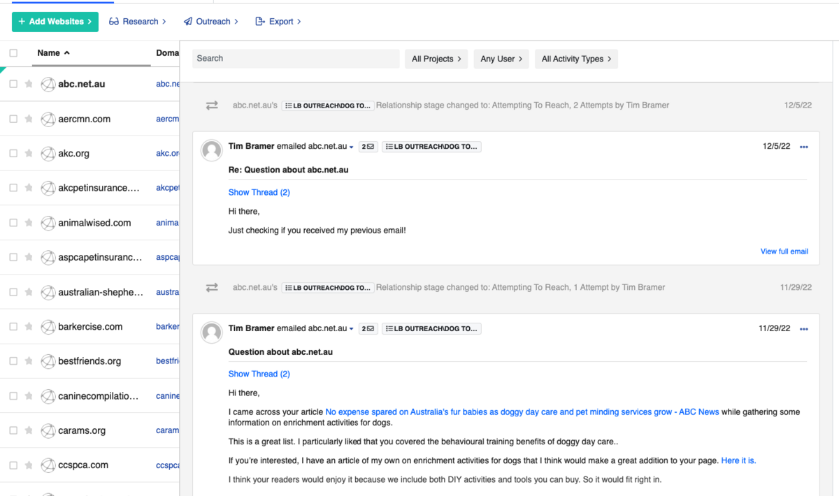 This means I can find a similar project within my BuzzStream database, look at who has gotten links, and then go back to see the exact outreach conversation.