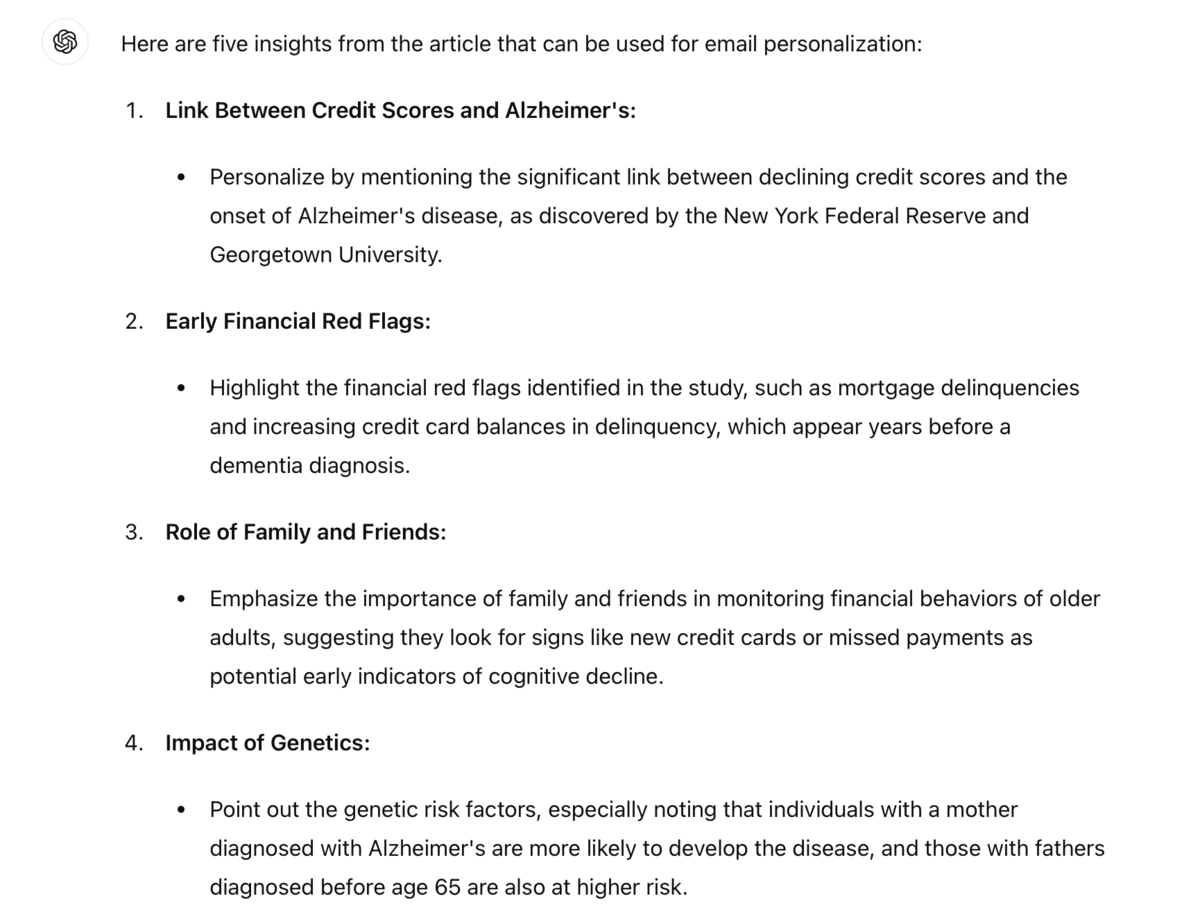 A shortcut to finding interesting insights to extract is to use ChatGPT. For instance, you can ask to extract some insights to use in email personalization: