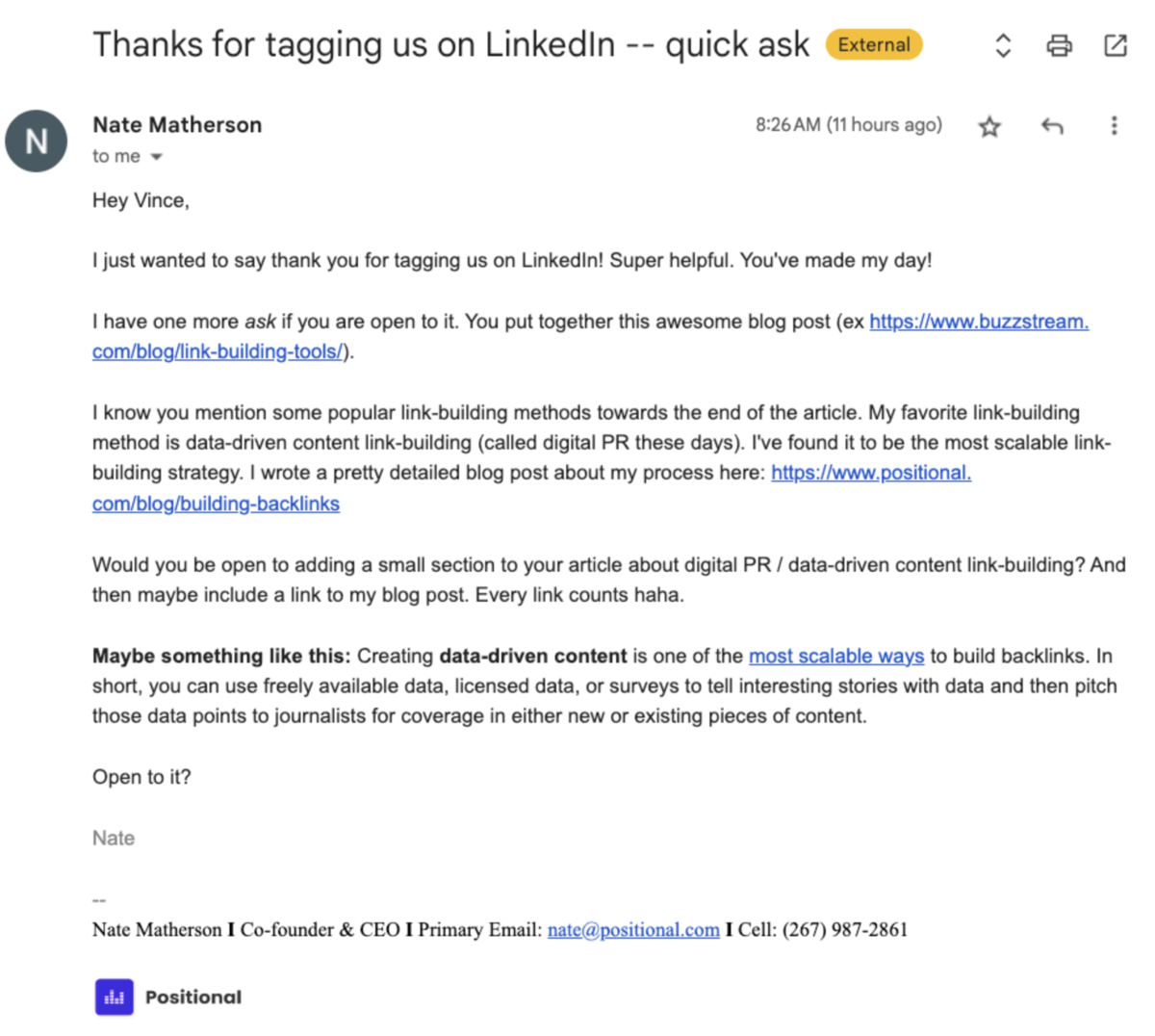 For example, I mentioned the brand Positional in a LinkedIn post. Then, the CEO commented on my post, which got on my radar.