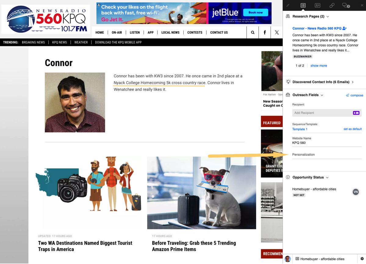 So, I saw that Connor from 560 KPQ NewsRadio “came in 2nd place in a 5k cross country race”, which is an interesting tidbit that could stand out in a pitch.