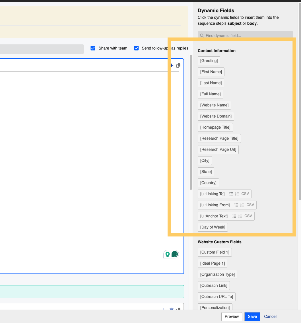 I then use these Custom Dynamic Fields to set up personalization messages or notes I find while researching contacts.