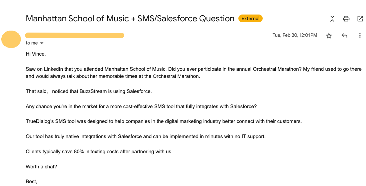 This wasn’t a fit since we don’t use Salesforce, but it got me to open and respond to the email.