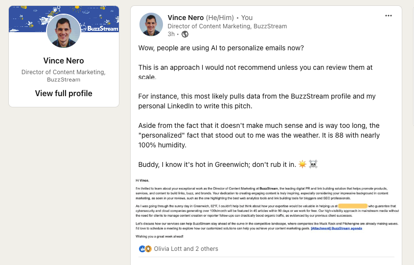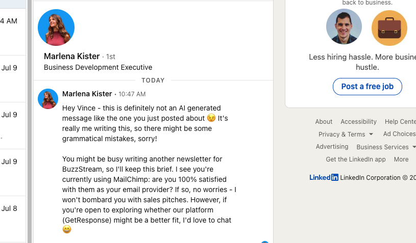So, Marlena Kister of GetResponse messaged me on LinkedIn and specifically called out that this wasn’t an AI-generated message.