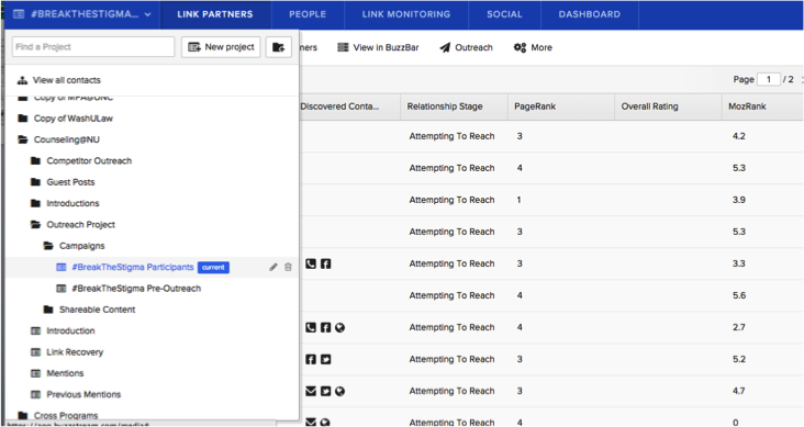 Counselors are especially passionate about combatting stigmas associated with mental illness. For Mental Health Awareness Month, Counseling@Northwestern sparked a dialogue titled “Break the Stigma,” aimed at uniting mental health advocates in an effort to shatter the stigma surrounding mental health and illness. BuzzStream was a critical tool for recruiting support and establishing trusted long-term relationships with thought leaders. Below we demonstrate how Buzzstream helped us build relationships with 50 reputable mental health organizations and incorporate their thought leadership to promote a unifying message.