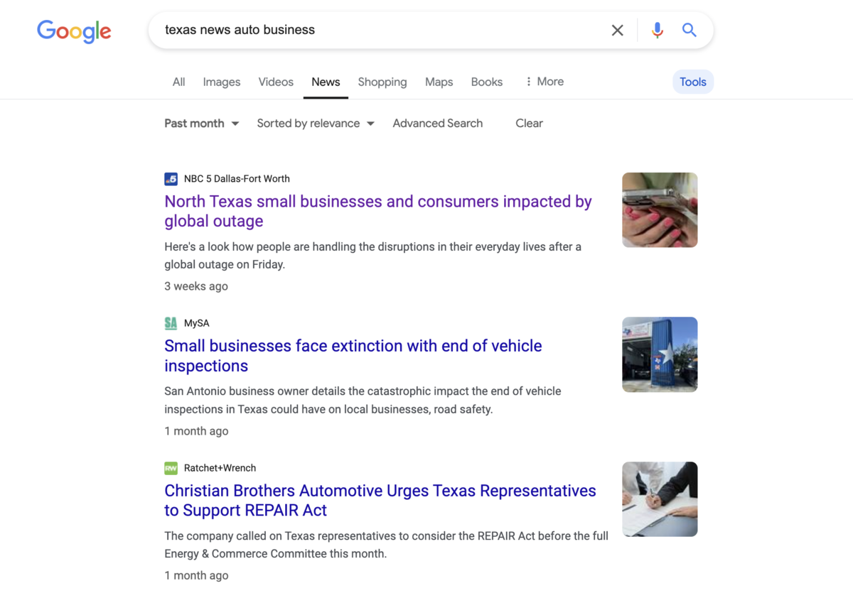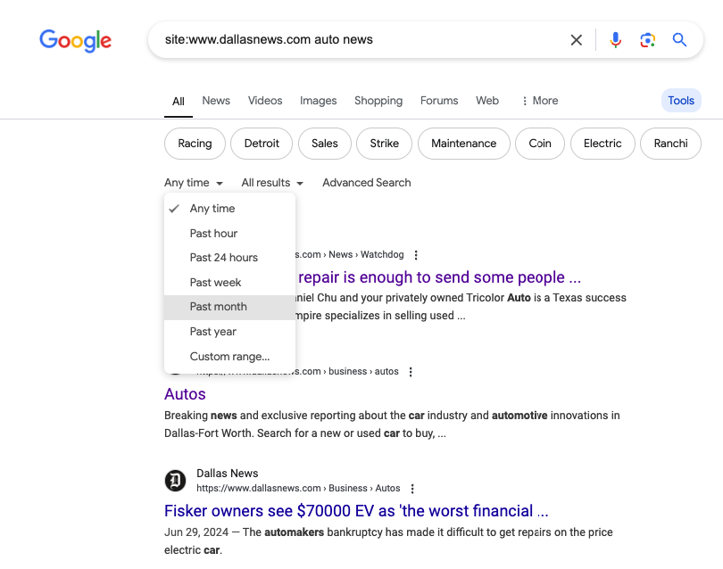 We can search Texas auto news in Google News and set the date range to the past month. This will allow us to find articles written about our topic.