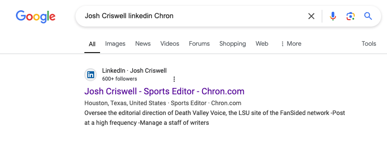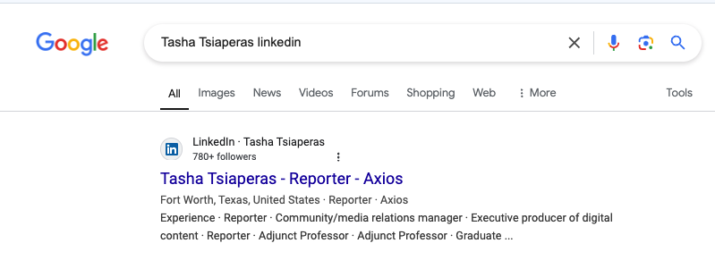 For example, if I tried to find Tasha Tsiaperas’ information on Linkedin, I did a quick Google search of her name + LinkedIn.