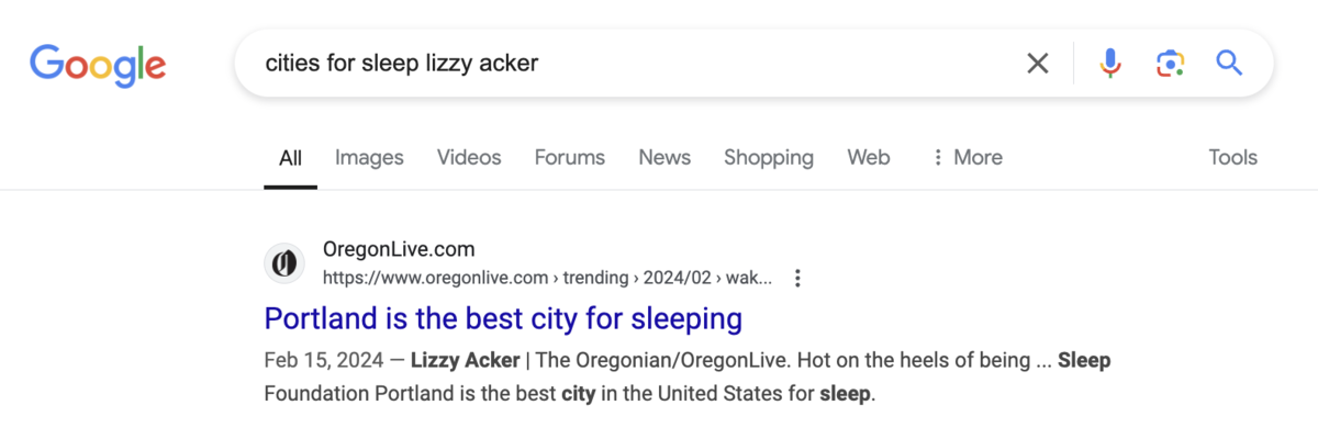For instance, if I were pitching the “best cities for sleep” and found Portland to be one of the best cities, I might be tempted to pitch Lizzy Acker.