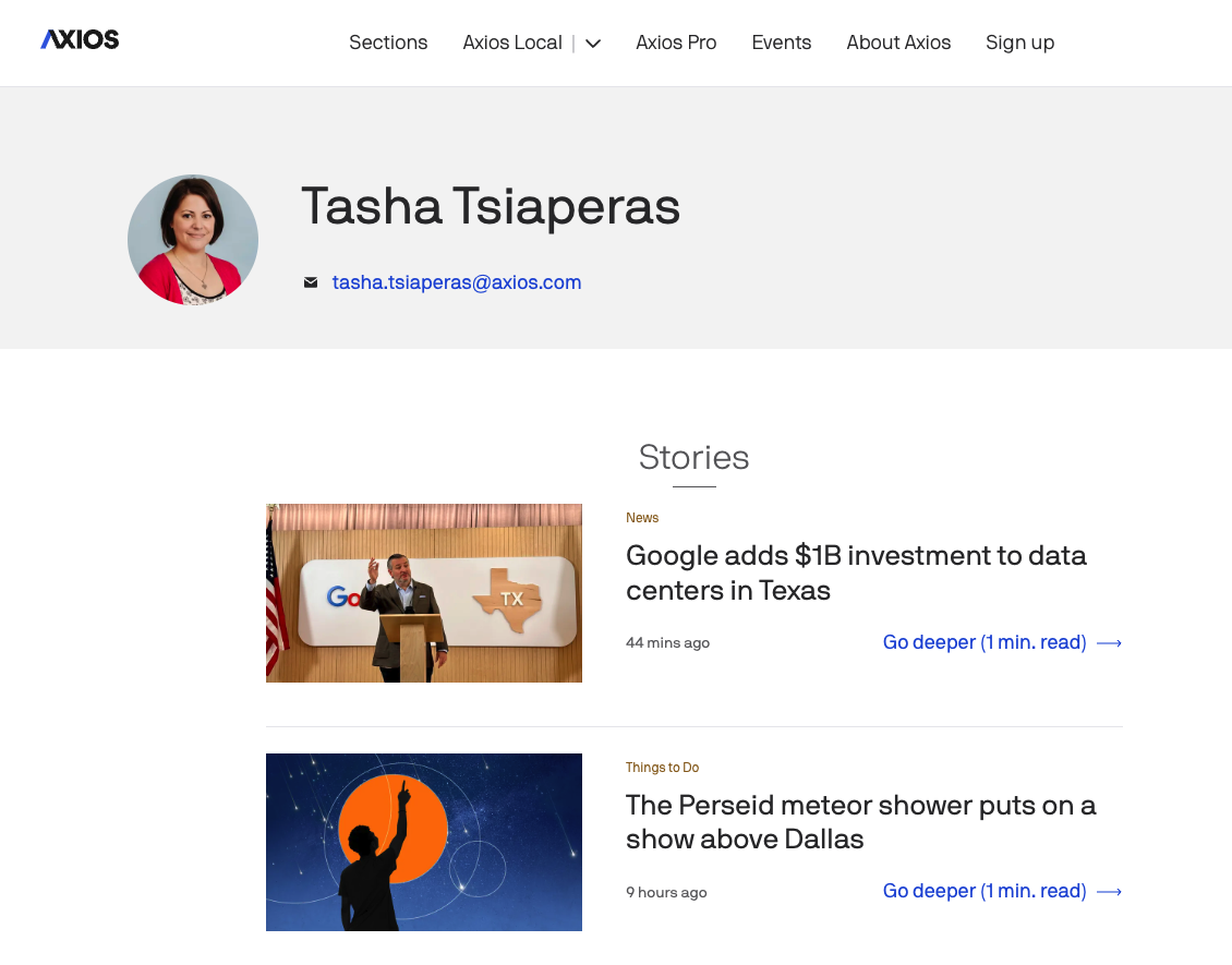 For example, here is a journalist who writes for Axios, with her email listed directly on the page: