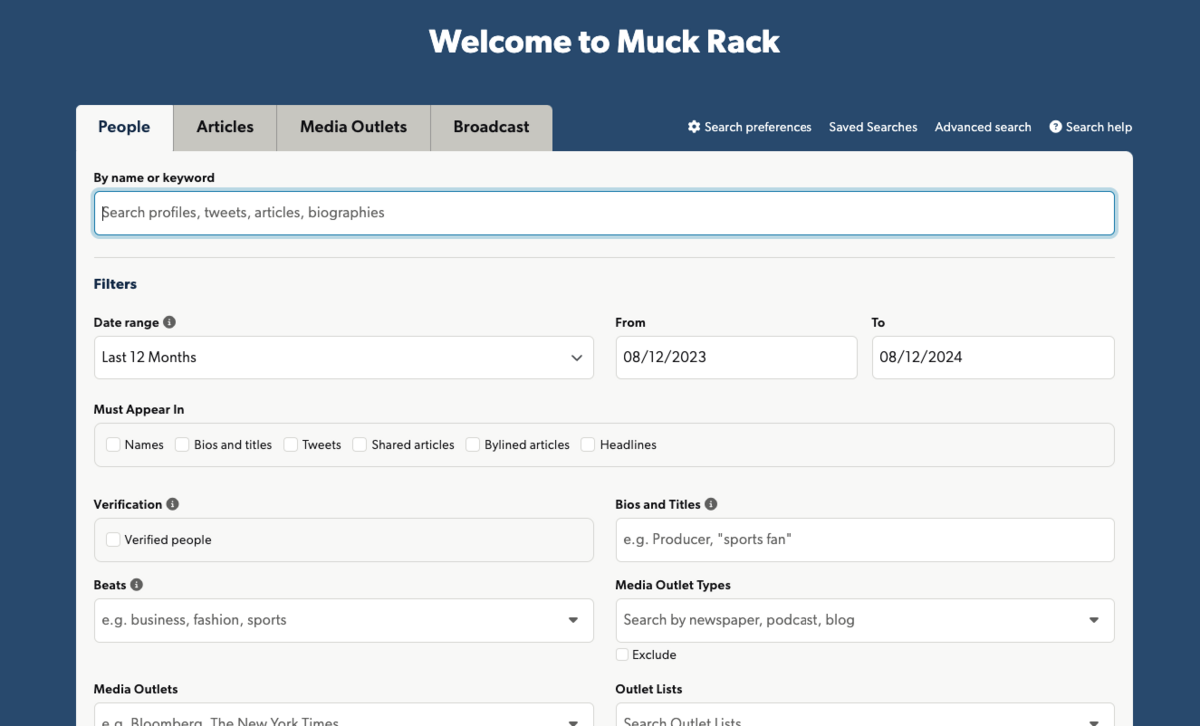 With a media database like MuckRack, you can search for a journalist based on the industry, keywords in bios or articles, or by specific publications.