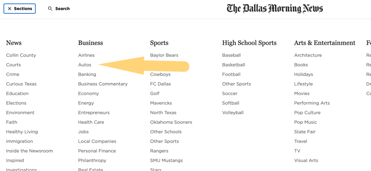 In the case of The Dallas Morning News, we can find an automotive news reporter by clicking into the Autos section of the site: