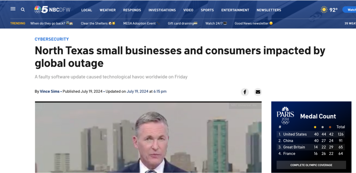 The first result is NBC 5 Dallas-Fort Worth. Here is a post about North Texas and businesses impacted by the global tech outage.