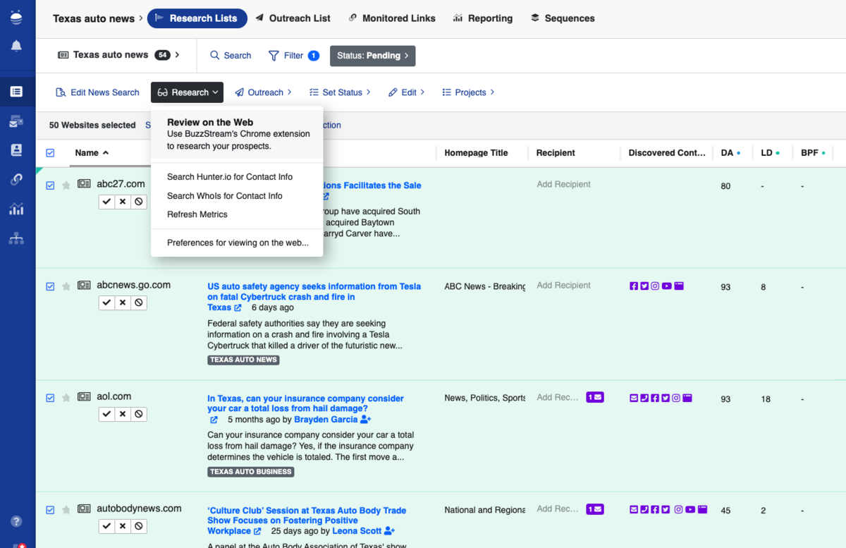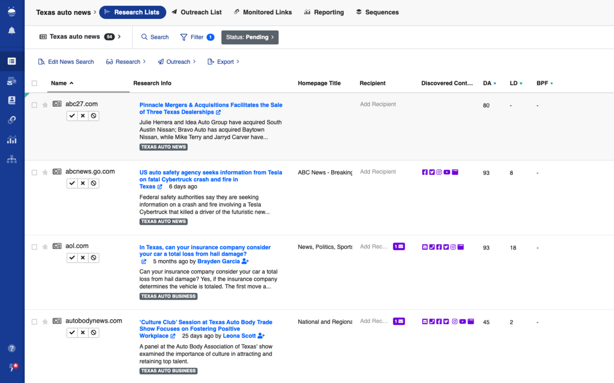 Then, I evaluate the pages and run the previously-mentioned processes to identify relevant journalists at those publications. First, I select all of my sites and go to Research.
