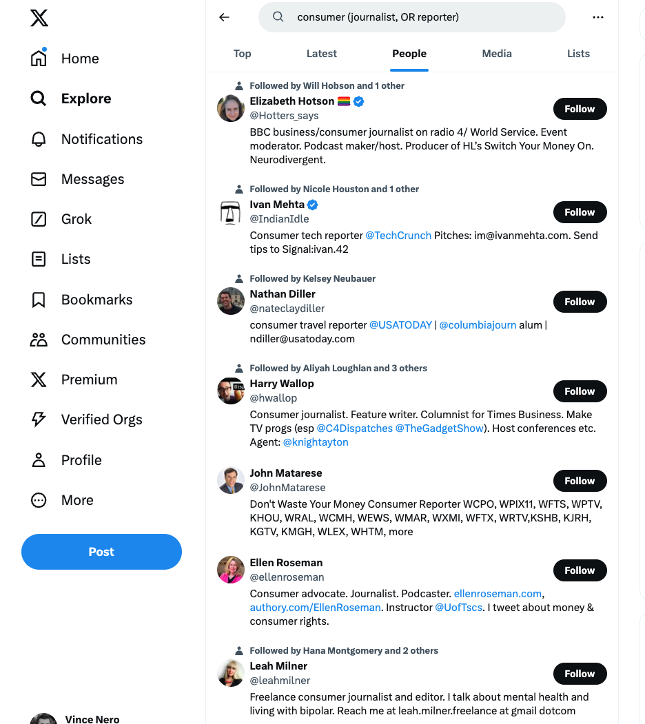Journalists can also be found on social media. I’ve found that journalists are most active on Twitter/X.