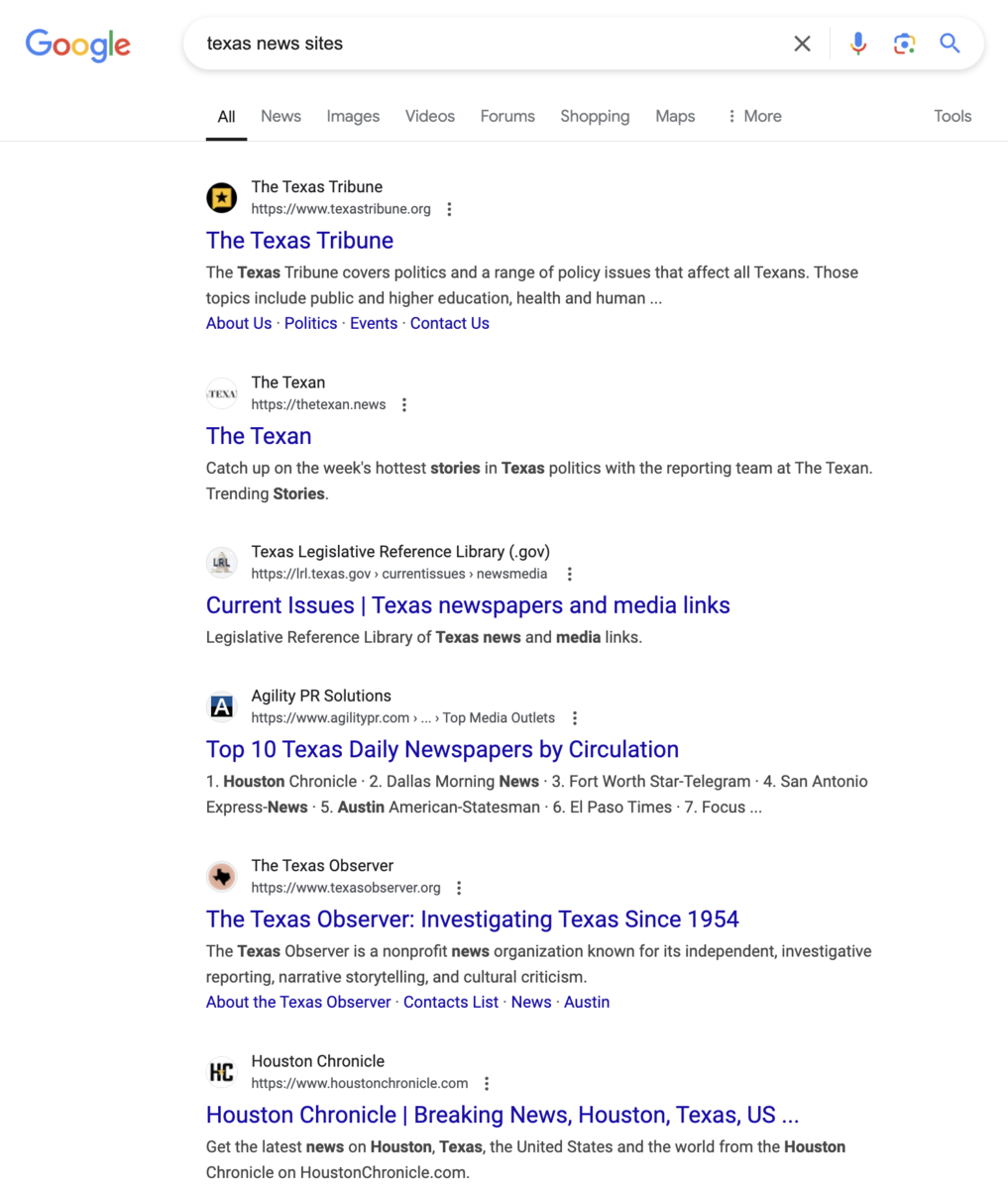 For instance, if I wanted to find “Texas auto news” and “Texas auto business,” I could simultaneously perform a Google News search.