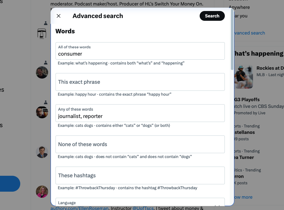 Twitter/X has an Advanced Search tool that you can use to find journalists.