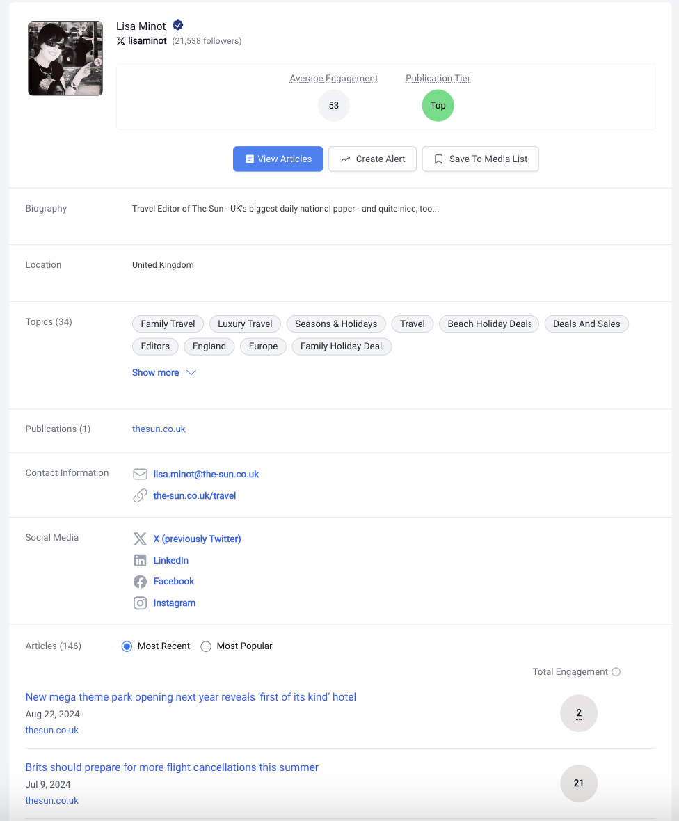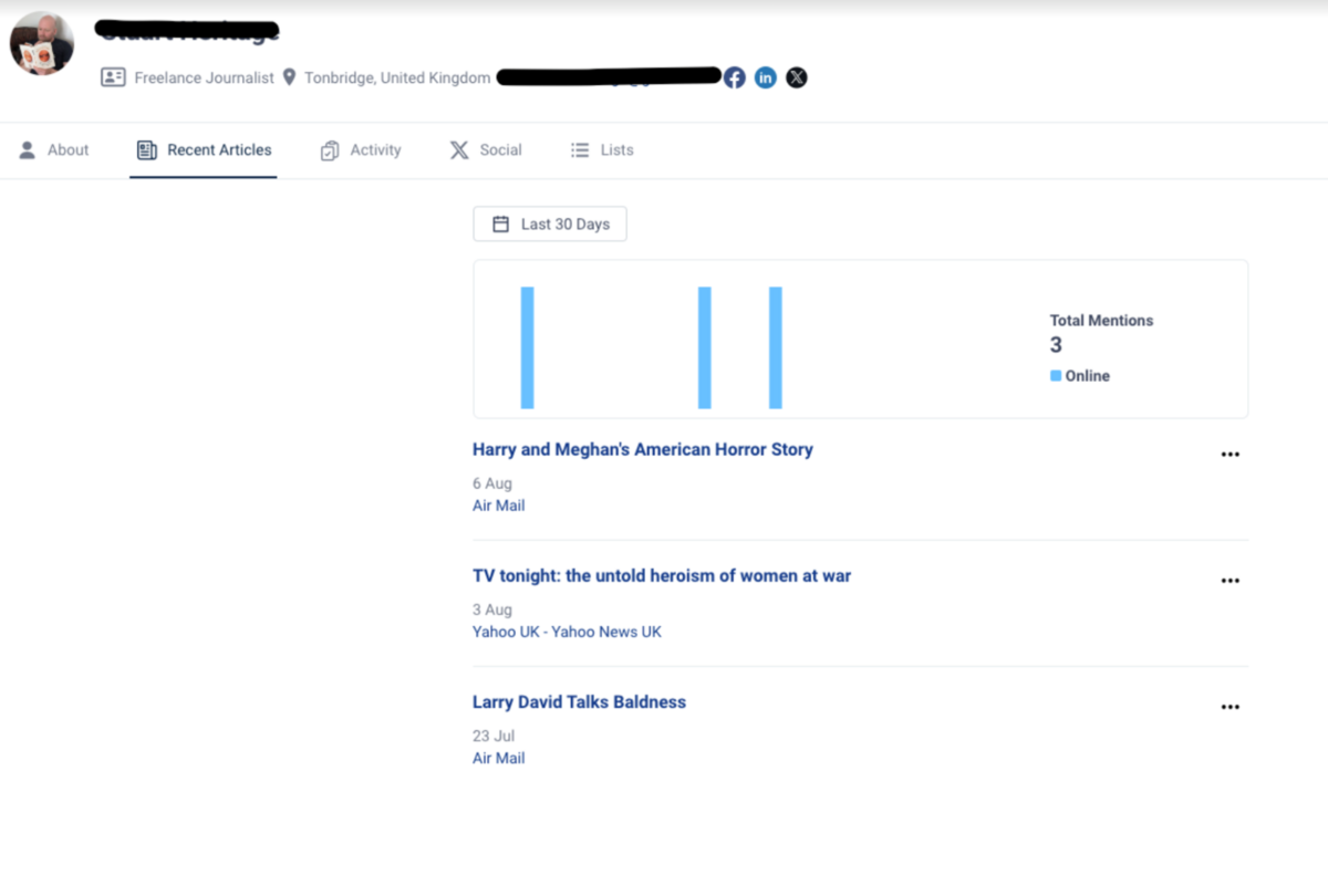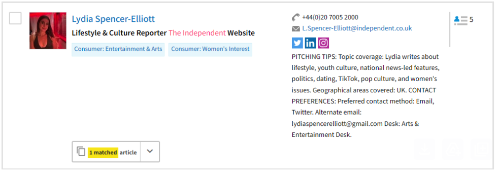 The ‘Recent Articles’ and Twitter feed overview in each journalist’s bio are great ways to check the frequency of their coverage and whether they actually write about relevant topics.