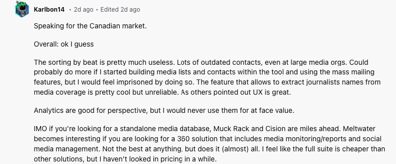 I reached out to some users about Meltwater from a media database perspective, and most felt that it was really a media monitoring tool first and a media database second, putting it behind Cision and Muck Rack.