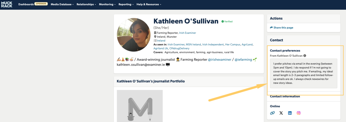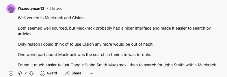 You can see that mention on Reddit where the search feature within the database is not as good as simply Googling “Journalist Name + Muck Rack.”