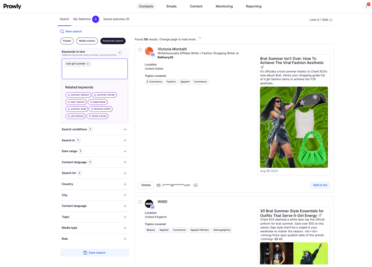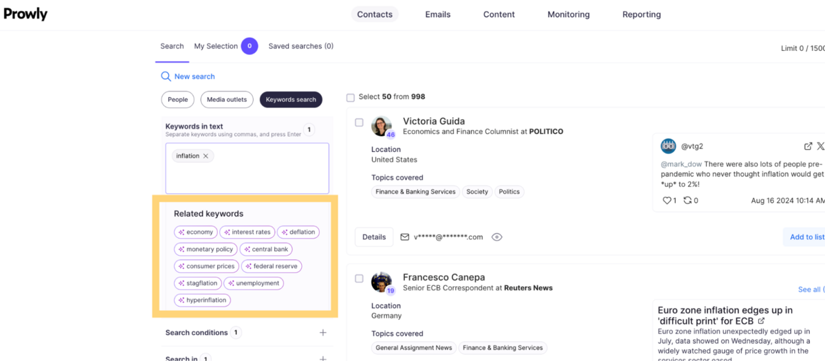I like Prowly’s AI-powered keyword suggestions as part of their Keyword search.