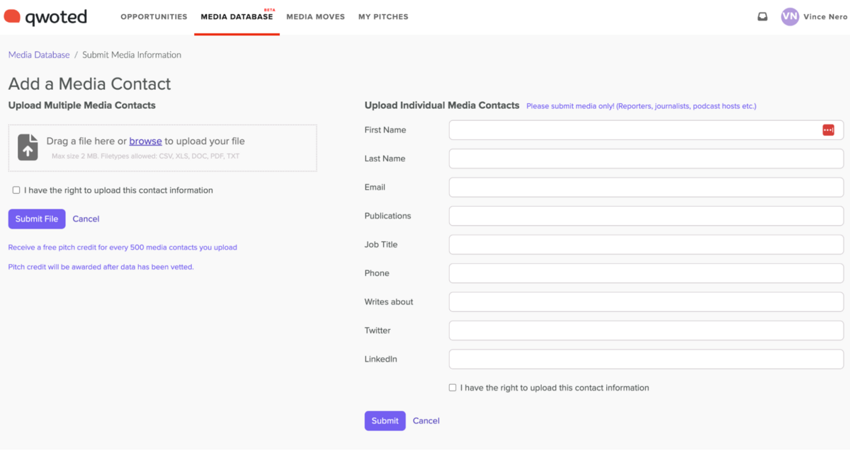 The key “feature” here is that you can get free pitch credits if you add your vetted, confirmed media contacts.