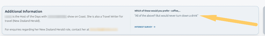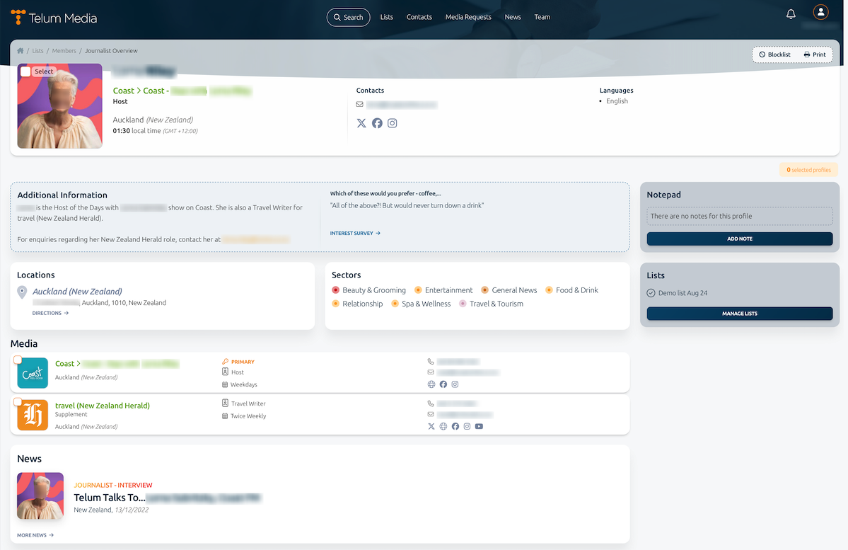 Telum also provides a journalist Q&A, which the journalists answer and which shows useful information such as the best time to contact them, what they are interested in, the best way to reach them, etc.