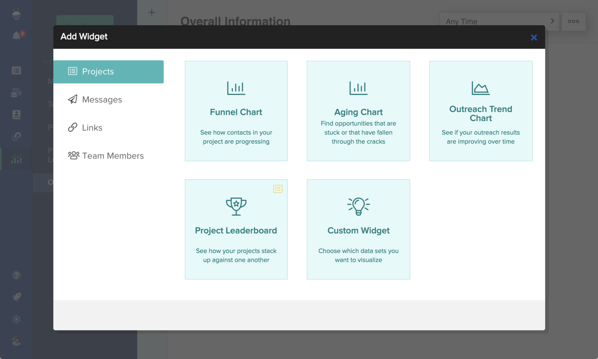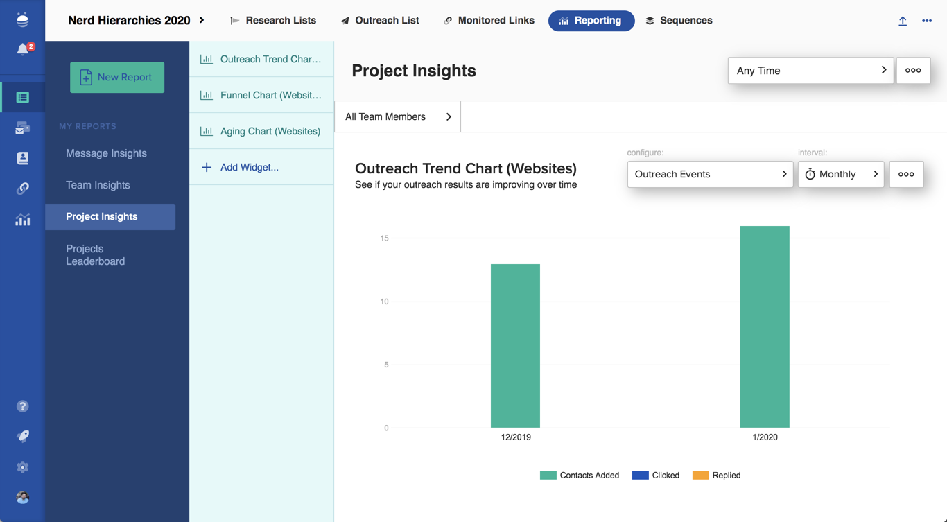 Similar to Monitored Links, Reporting will show you the reports that are specific to the project you’re in. Here you can leverage any of our pre-built reports, or even build custom reports to get key insights into your campaign.
