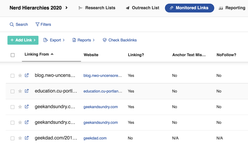 The Monitored Links tab in your project will show you links that you’ve added to the specific project you’re in. It’s the place where you’ll add or review your earned links. BuzzStream will also automatically check for backlinks on specific pages if you’re targeting them.