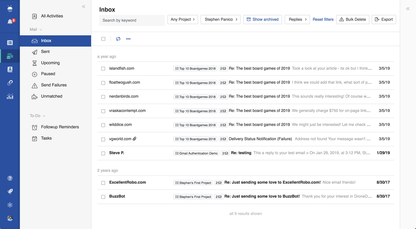 Here’s where you can view your inbox, as well as sent, upcoming, paused or failed emails. You can easily filter emails by project or person, and can also look specifically for replies. This gives you a quick way to manage and respond to emails in a campaign (or across all of your campaigns), as well as review team activities.