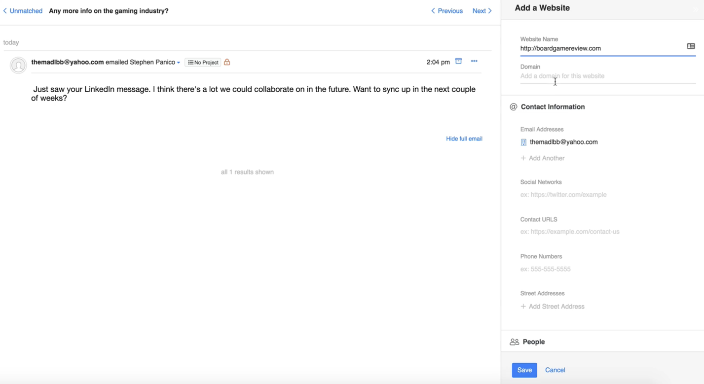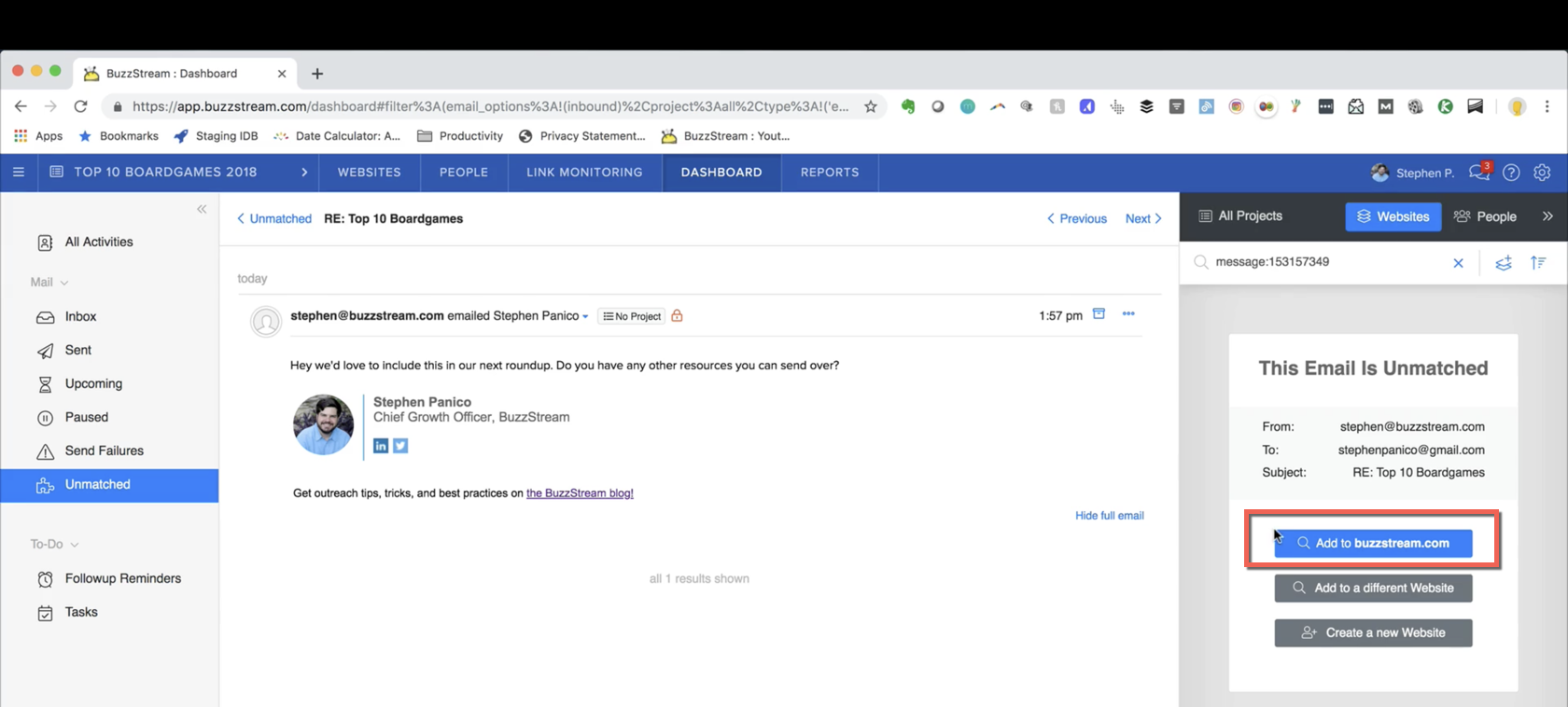 All you need to do is click on that email in Unmatched. You’ll see that, if the website is already in your account, BuzzStream will automatically detect that from the associated domain and give you the ability to match it with the contact.