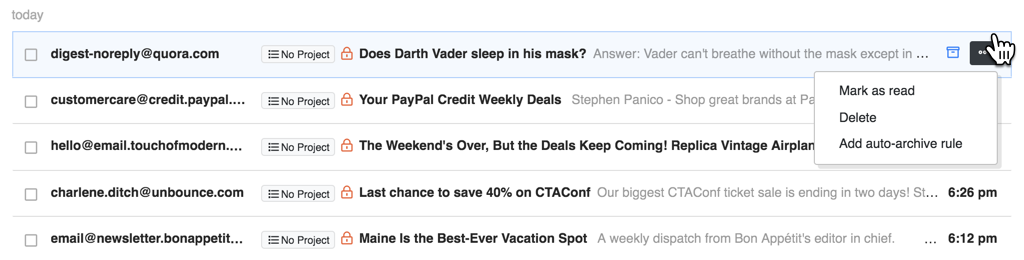 Handling these is simple. Just click on the three dots to the right of any email you select. From there, select “Add an auto-archive rule”.