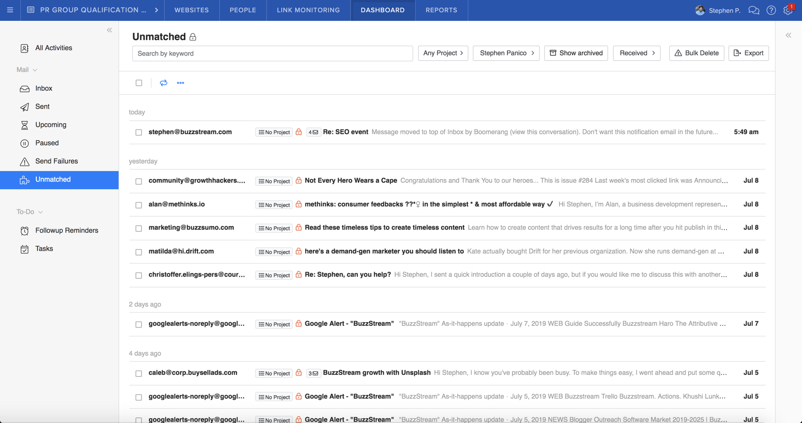 Because BuzzStream is pulling in emails that aren’t associated with websites/people already in your account, we wanted to give you a way to quickly clear out emails that are irrelevant and make sure emails from those senders never clutter up your unmatched folder again.