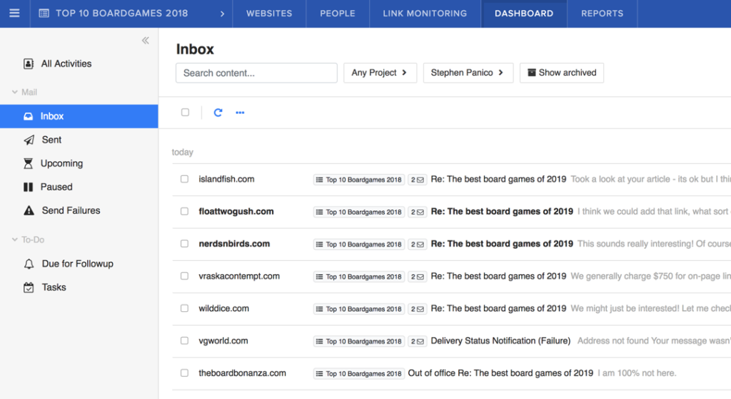 We’re extremely excited to announce the completion of a new Dashboard and Inbox in BuzzStream. The Dashboard gives you a single place to act on all of your emails and tasks, across all of your team’s projects and email accounts.