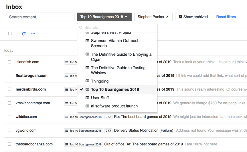 All of the messages in the dashboard are categorized and organizable by project so that you can view all of your emails in context. You can view project information at the individual email record level or filter by specific projects to maintain focus on an active campaign.