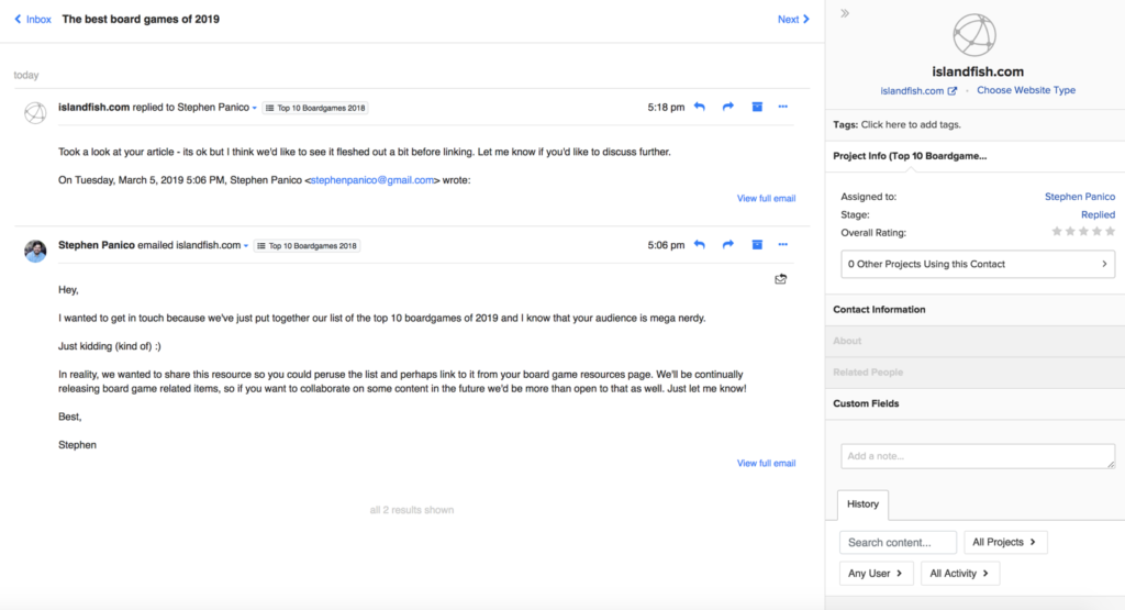 In addition to giving you context into associated contacts, the record is editable directly from the inbox. This opens up workflow opportunities that you can tailor directly to your team. For example, if you get a request for payment to review a product you’re pitching you could change the relationship stage from “Replied” to “In Negotiation”.